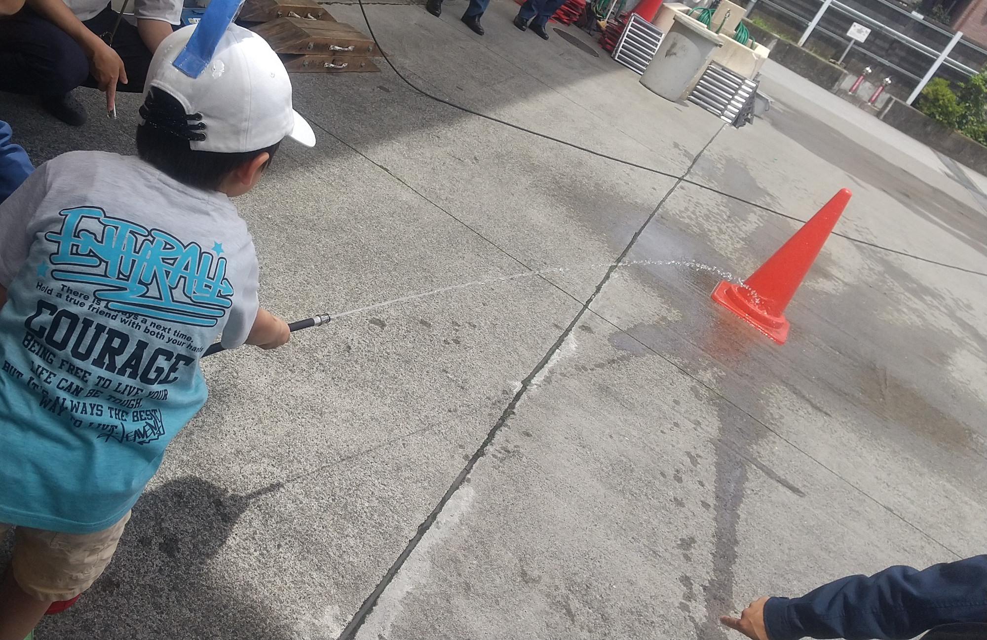 消火訓練では、訓練用の水が出る消火器を使用しました。ピンを抜くと水が出るようになっていて、ピンを抜くことに苦戦している子やホースを取る前にレバーを握ってしまい水が出たりすることもありましたが、繰り返し何度も挑戦しコツを掴んで、最後は上手にカラーコーンに向かって水をかけることができました。