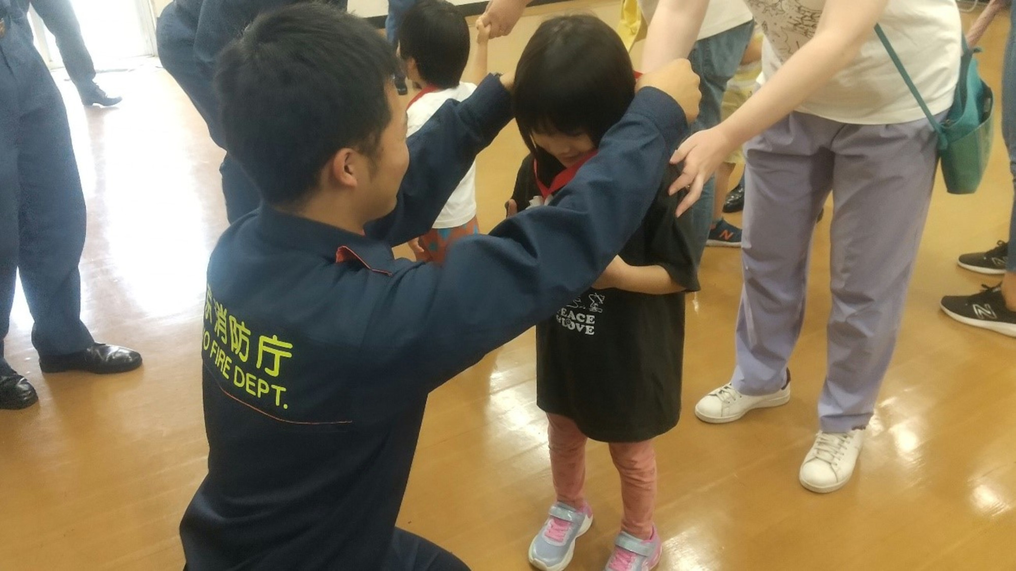 最後に頑張ったメダルを消防士の方から直接受け取った際は、緊張して恥ずかしそうに受け取る子もいれば、笑顔で受け取る子もいました。「ありがとう」とお礼を伝える姿も見られました。また、消防士の方と挨拶やハイタッチをして満足げな子どもたちの様子も見られました。