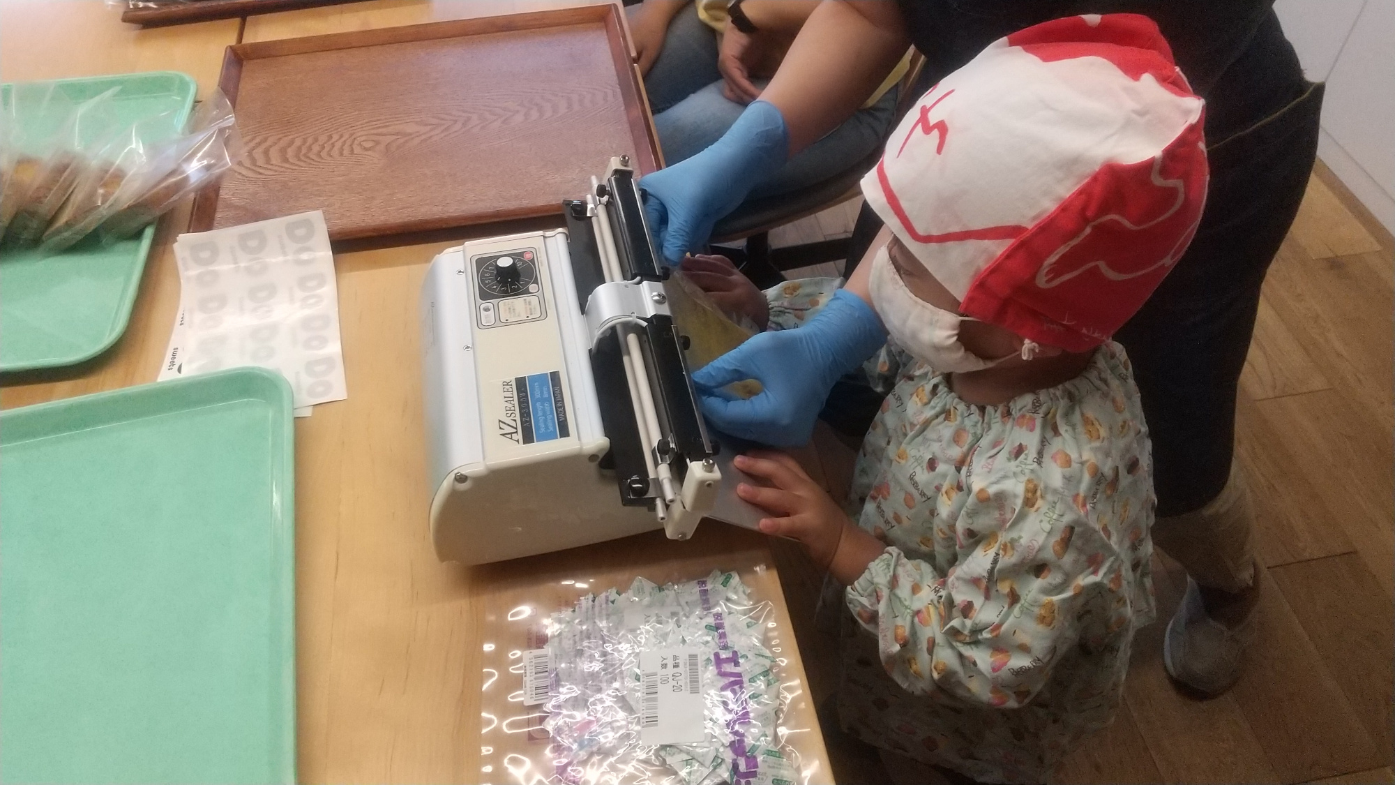 シールを貼り終えたあとは、シーラーを使ってドリップバッグの封をします。機械に手を添えながらぎゅっと下に力を入れると、綺麗に封がされます。魔法のように一瞬で袋が閉まるところをみて、驚いている子どももいました。