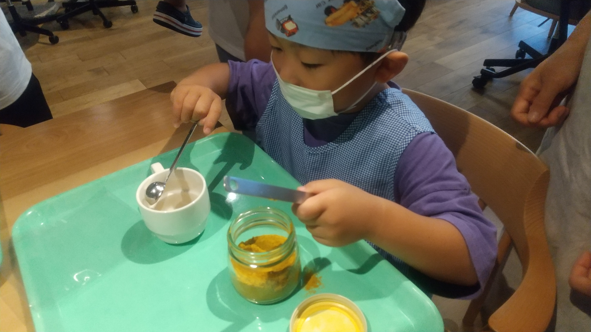 スパイスの粉をすりきりして容器に移していきます。間違えずに10杯数えて入れるというところがポイントでしたが、小さく声に出して数えながら間違えないように工夫していました。