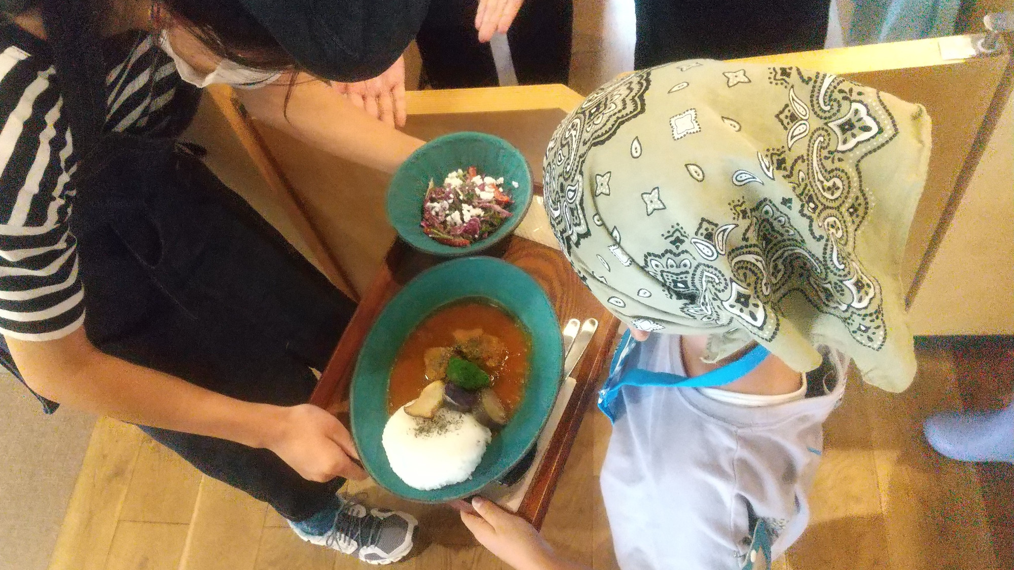 最後は、自分のお父さん、お母さんが注文したカレーを利用者さんから受け取りテーブルまで運びました。全員がこぼれないように慎重にゆっくり歩きながら無事にトレーを運ぶことができました。