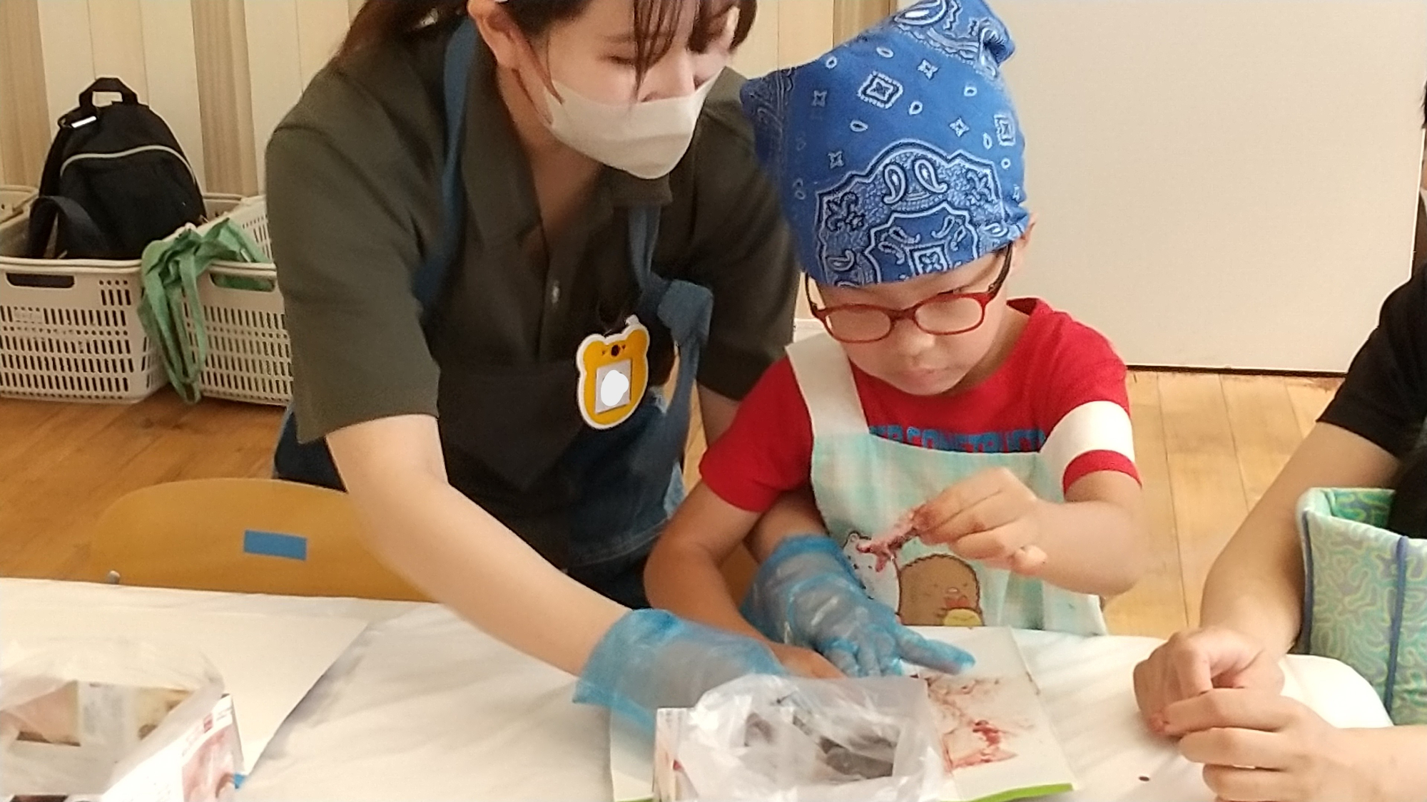 最初にエラから指を入れて頭を取り、手で開いていきます。内臓や血が出てくる様子を見て、驚く子がいたり、構造に興味を持つ子がいたり、反応は子どもによって様々です。「魚に感謝して食べなきゃだね」と話す親子のやりとりも聞かれました。