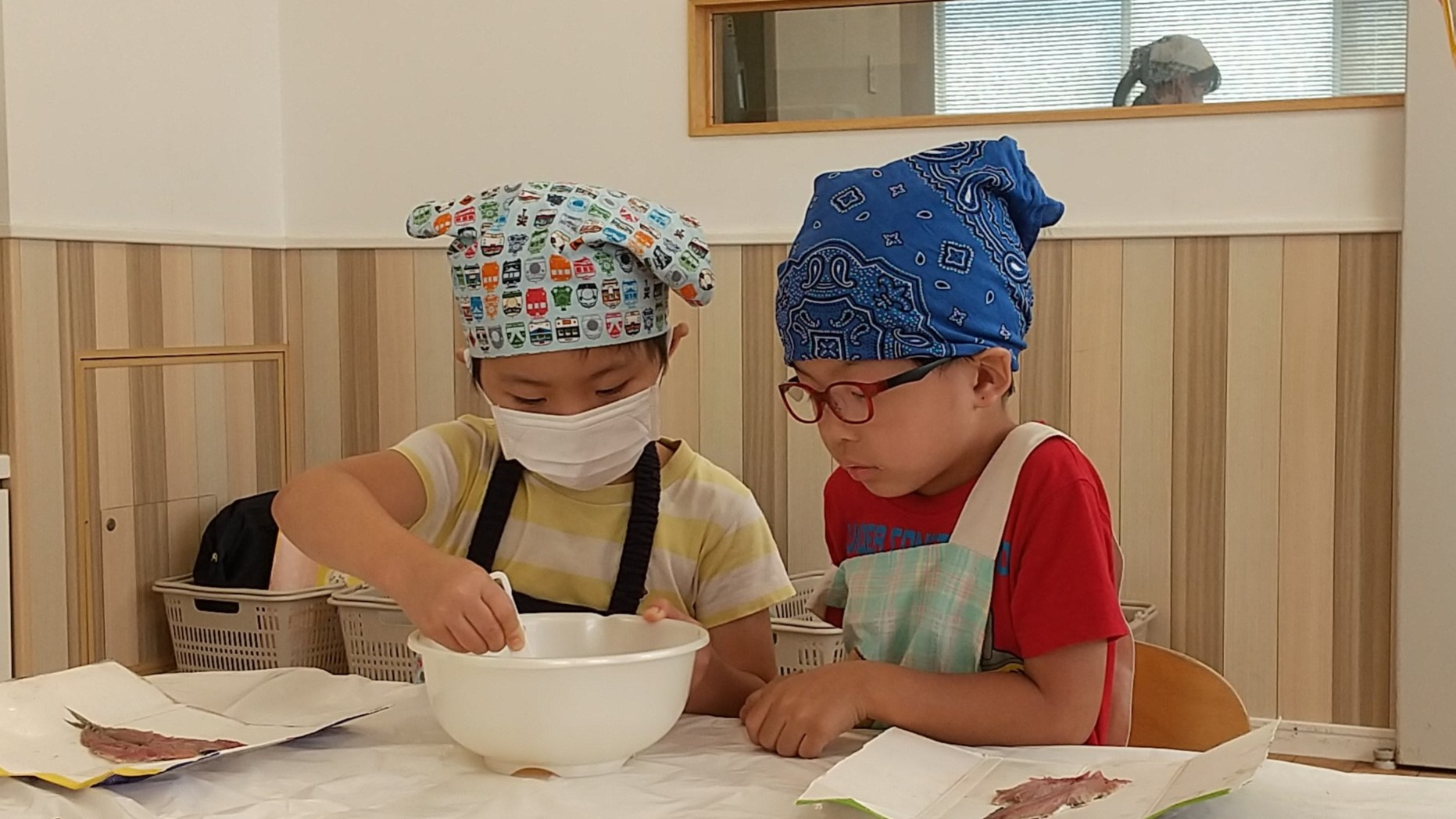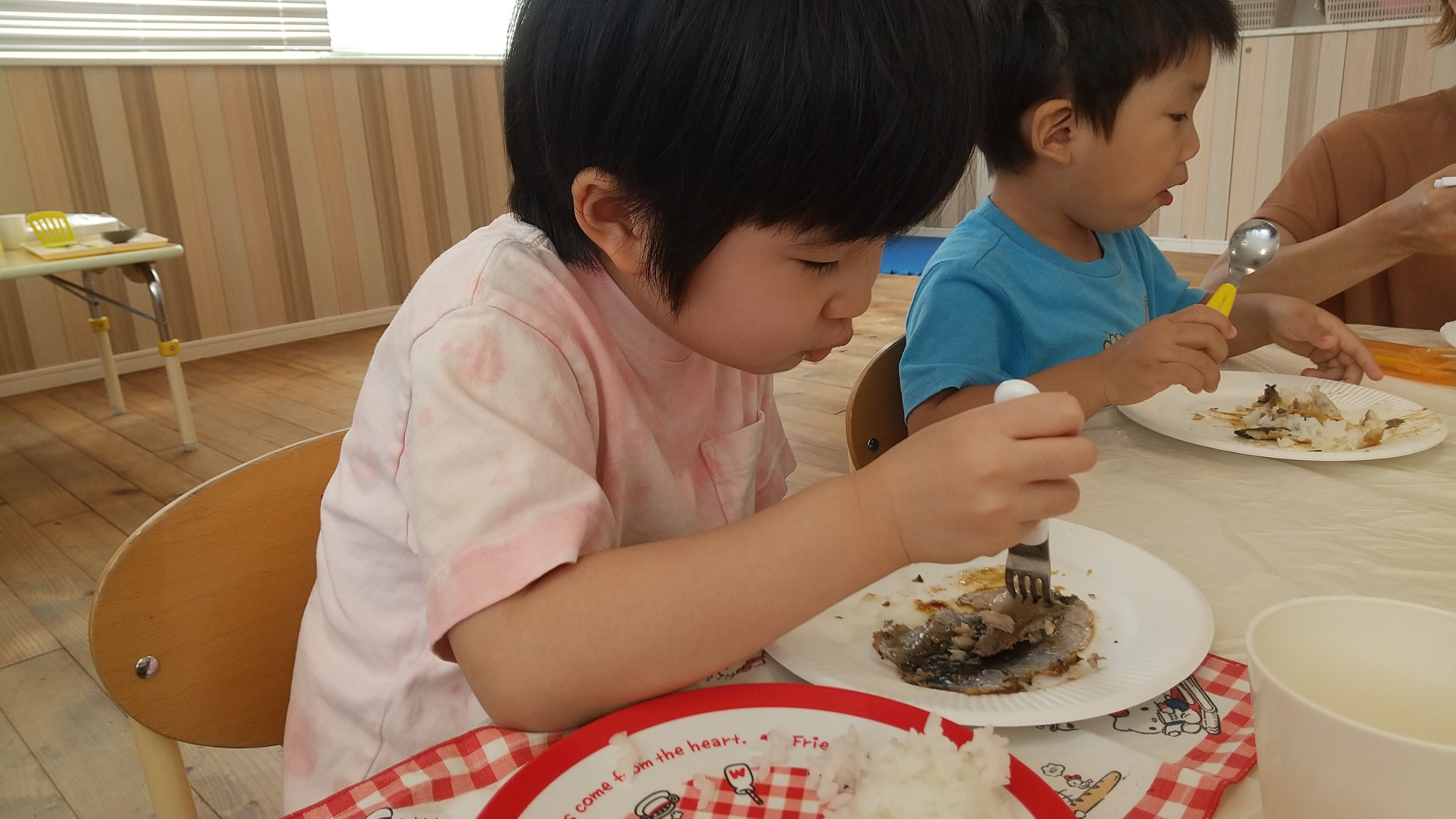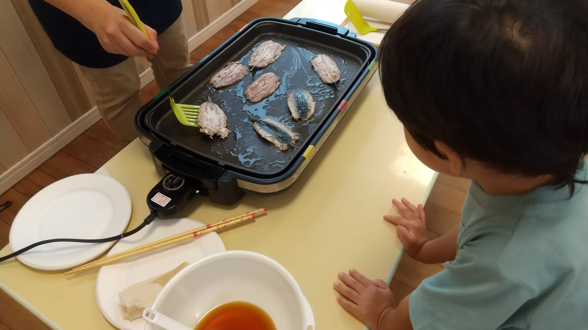 最後に、魚に小麦粉をまぶし、ホットプレートで焼くとイワシの蒲焼の完成です。子どもたちは匂いを嗅いで「おいしそう!」「早く食べたい!」と出来上がるのが待ち遠しくてたまらない様子でした。