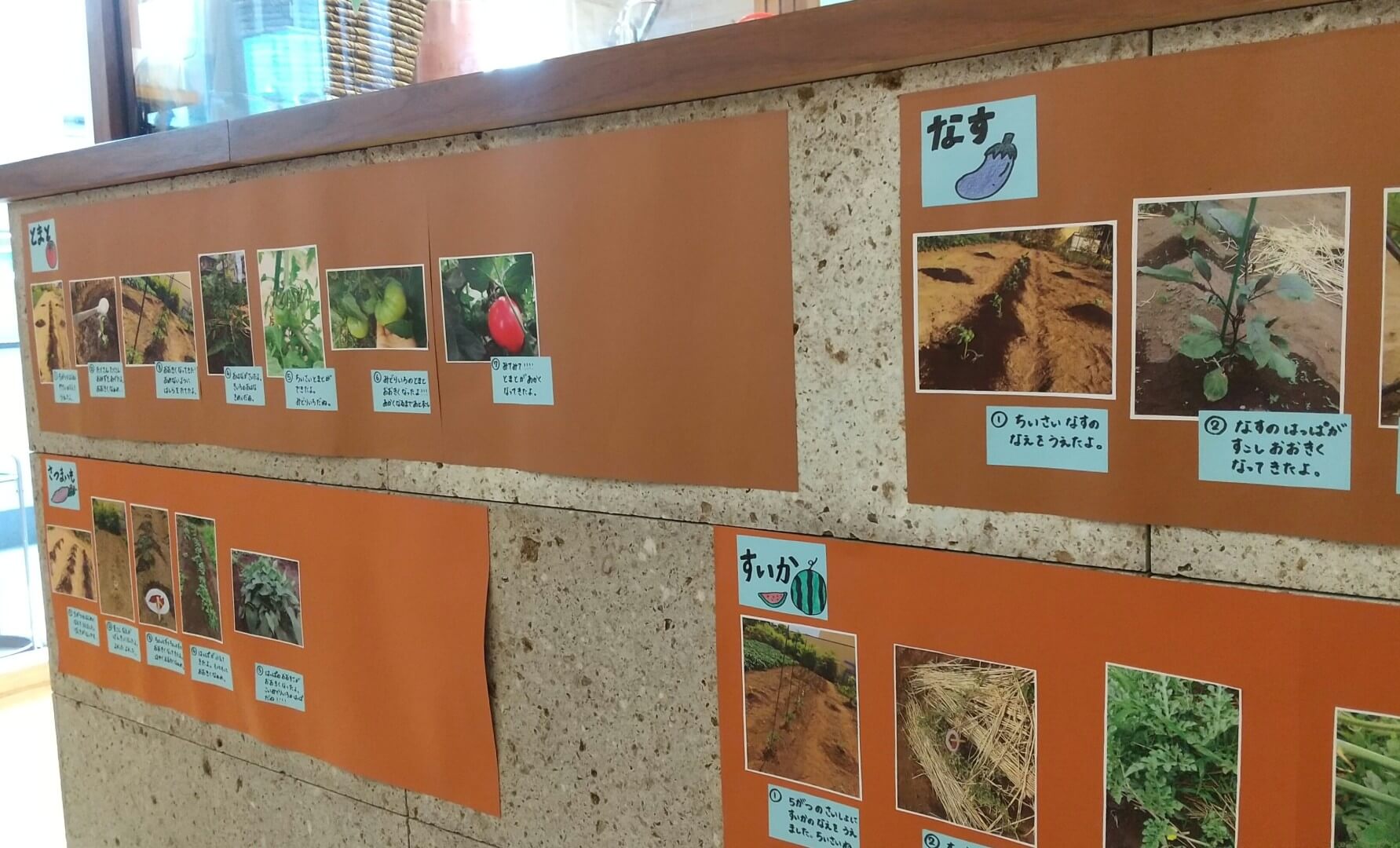 本物に触れてもらいながらも、野菜がどのように大きくなっていくのかがわかりやすいように、野菜の成長記録をカフェに掲示してあります。畑の様子が気になる子は自分から写真を見て、確認している姿があります。