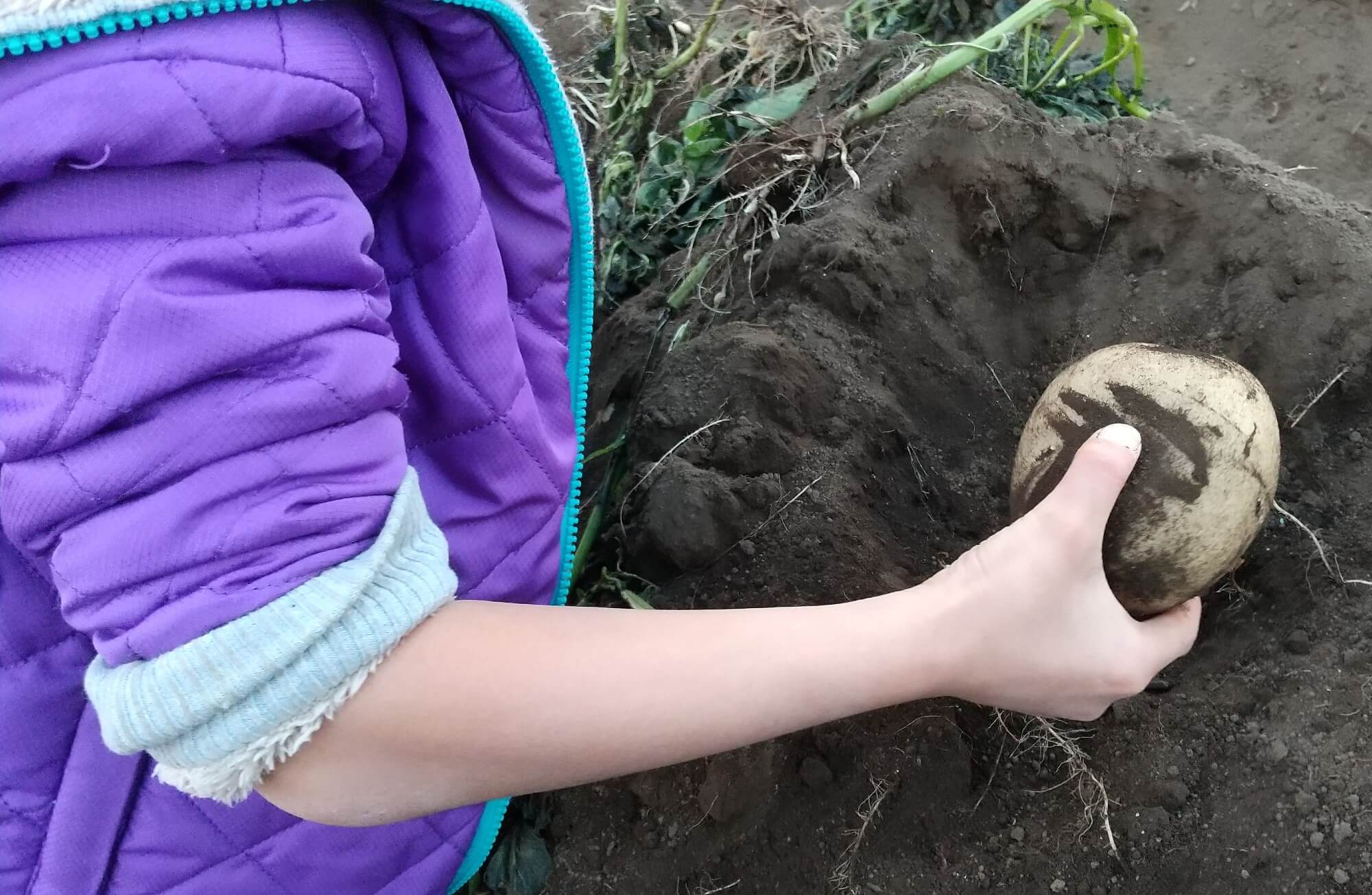 ジャガイモが深く埋まっていて、なかなか取れない時に友達が掘るのを手伝ってくれました。「はいどうぞ」とジャガイモを友達に渡していました。