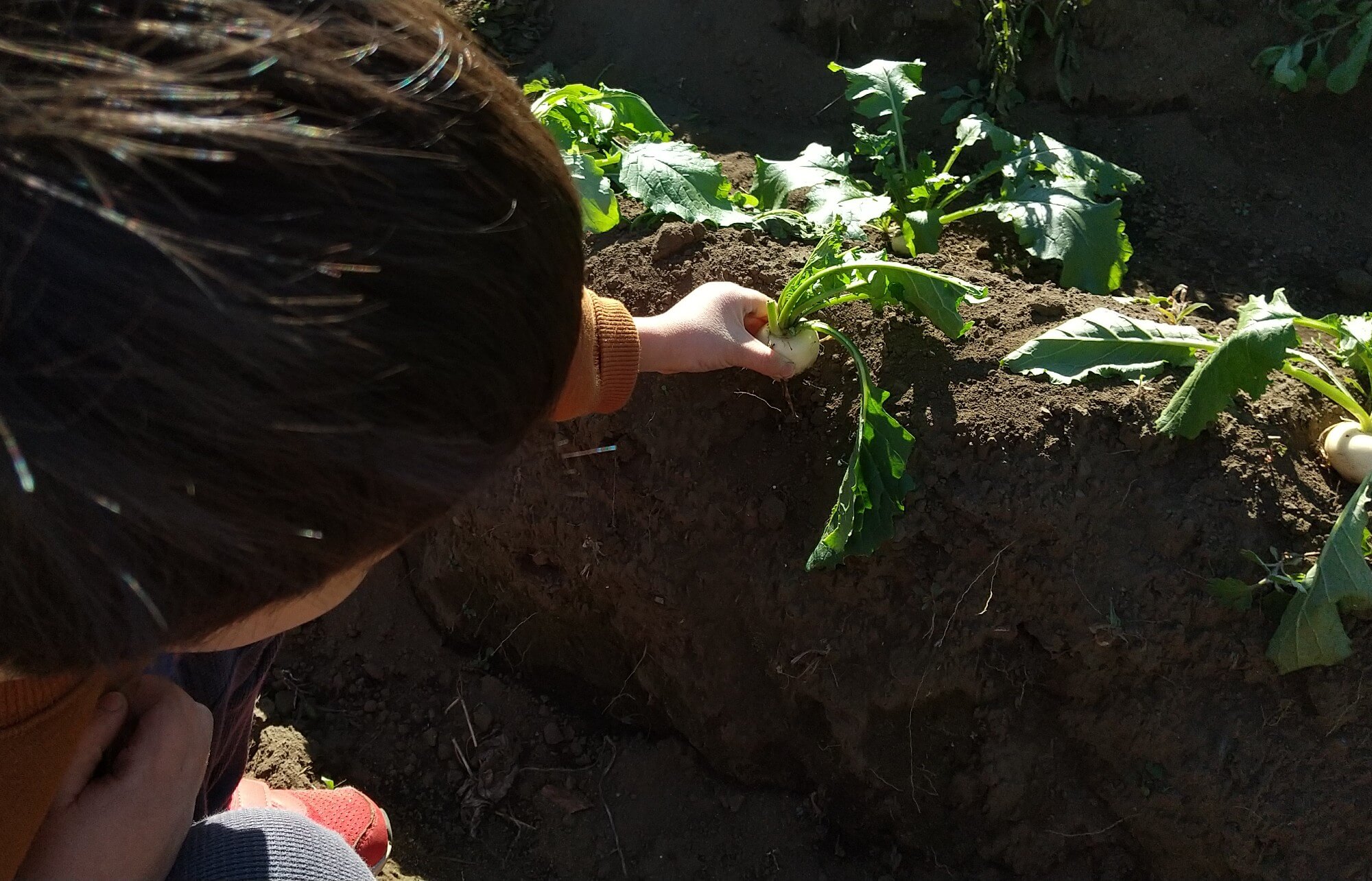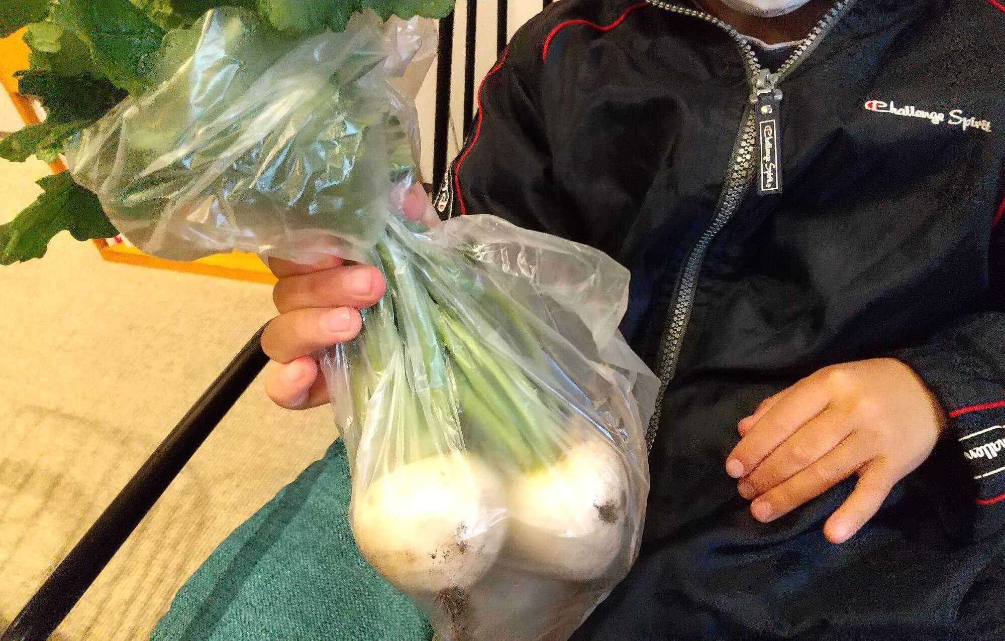 どの野菜を収穫するかは子どもたちに選んでもらっています。「これにする」と自分が収穫したいと思う野菜を選んでいました。カブは大きくなると実の部分が大きくなり、浮き上がるため、見つけやすい様子。また、手が汚れることが苦手な子でも葉っぱを引っ張ると抜けるため、収穫しやすそうでした。間引きを忘れて、小ぶりなカブになりました。