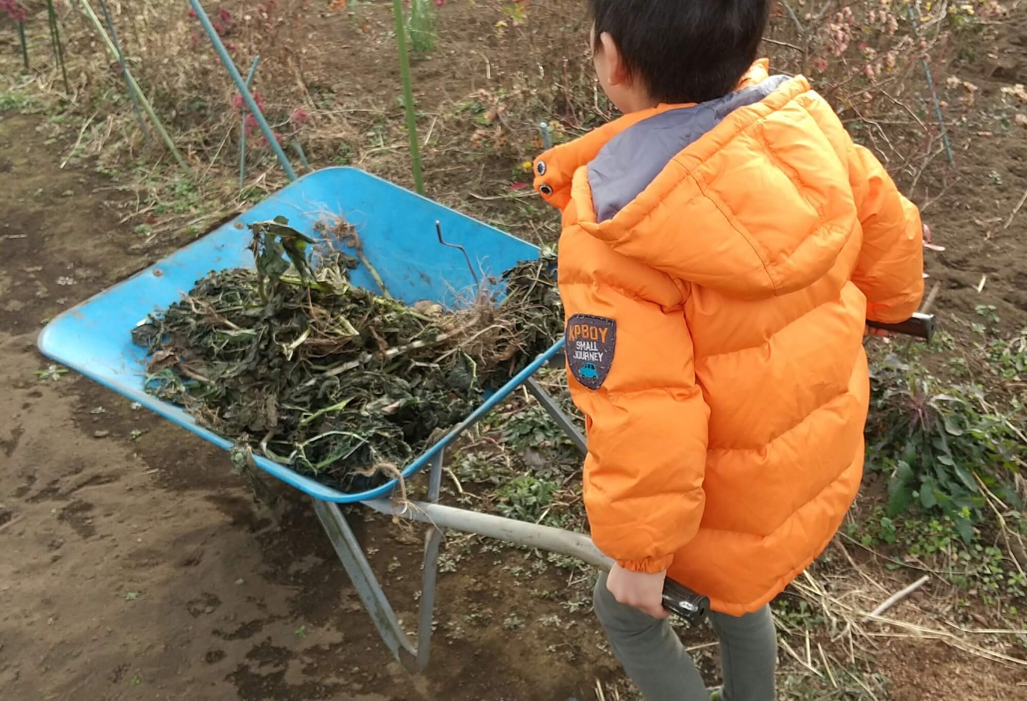 今年は畑の後片付けも子どもに行ってもらいました。一輪車いっぱいに雑草や残った茎を入れて運んでくれました。一輪車はバランスを保つのが難しく運ぶのに苦労する子もいましたが、頑張っていました。「みんな、綺麗になってびっくりするかな」と楽しみながら取り組んでいたことが何より印象的でした。