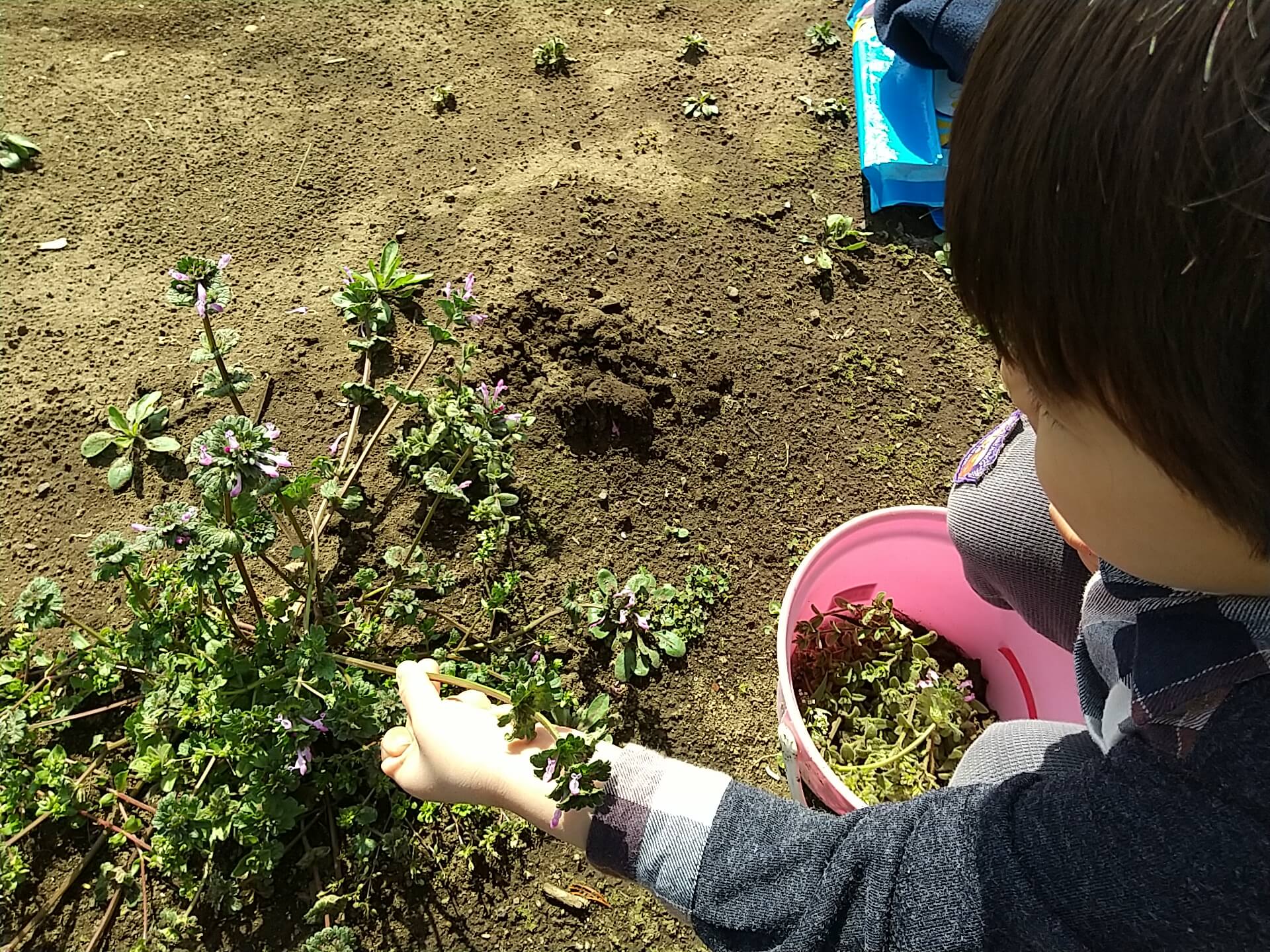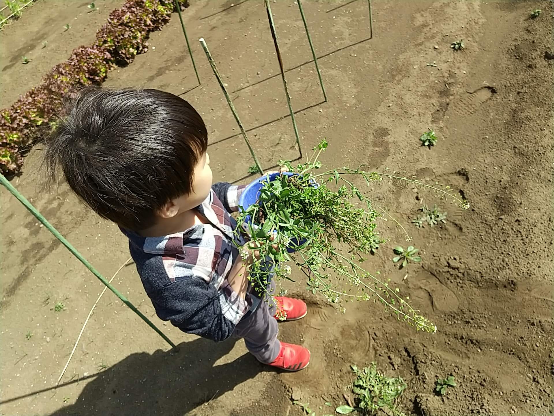 バケツいっぱいに雑草を取ることができました。一緒に畑を綺麗にしてくれた子は、勝負をすることが好きなため「どっちが沢山取れるか」を勝負し、楽しみながら雑草を抜きました。抜いた雑草を見て、「すごいね、いっぱいだね」と共有して達成感を味わいました。