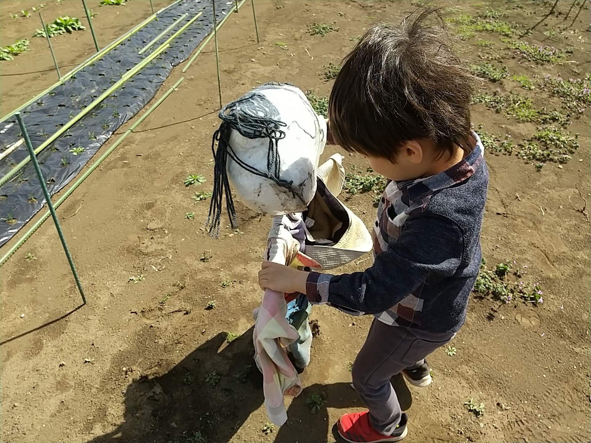 2020年度、畑を守ってくれた「かかし」にお礼を言って、どうしたら抜けるかを自分で考え、引っ張る・回すなど試行錯誤しながら抜きました。2021年度も、また畑を守ってもらえるよう、子ども達と作りたいと思います。
