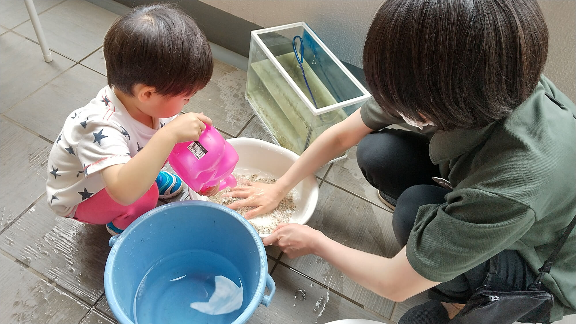 取り組んでいる中でじょうろの操作が上手になり、水槽がきれいになったことにも満足しているようでした。