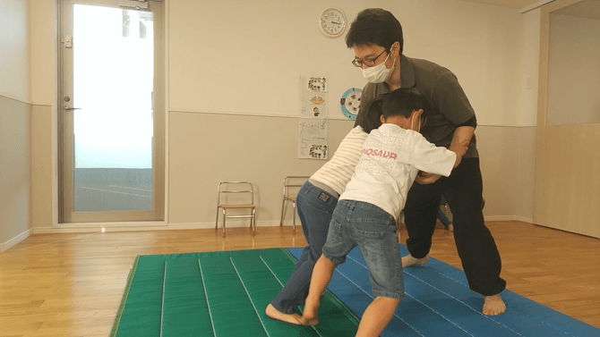 この日は「相撲」を行いました。なぜ相撲を行ったかというと、グループが始まった当初、初めて全員が活動に参加できた活動だからです。相撲をきっかけに体を動かすことに自信を持った子がたくさんいて、保護者の方や子どもたちからも「家で相撲をやっている」というお話を伺っていました。そして、「相撲をまたやりたい」というリクエストが日頃から出ていたことも理由の一つです。