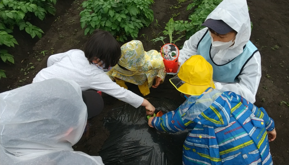この日はあいにくの雨でしたが、畑にすいかの苗を植えに行きました。