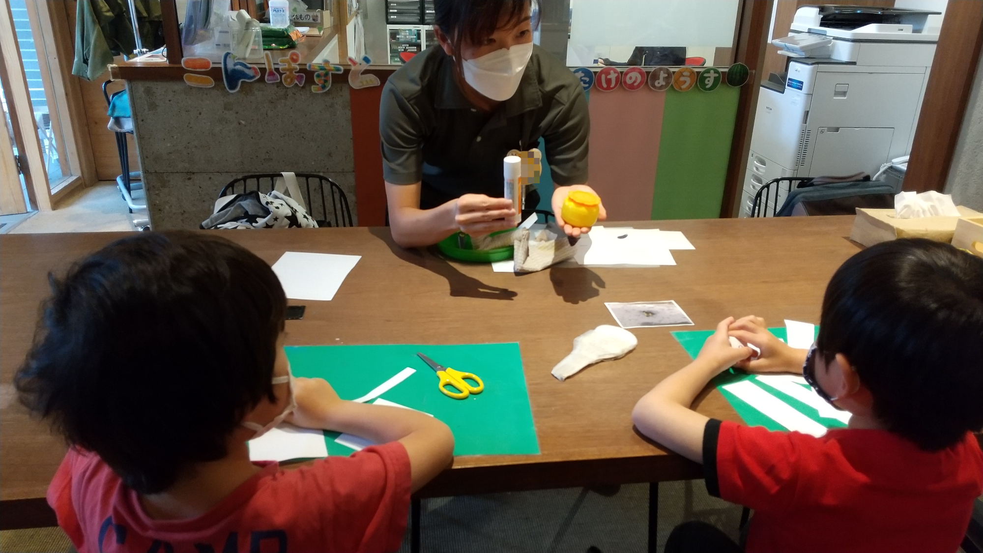 スティックのりとでんぷんのりのどちらを使うのか選ぶ子どもたち