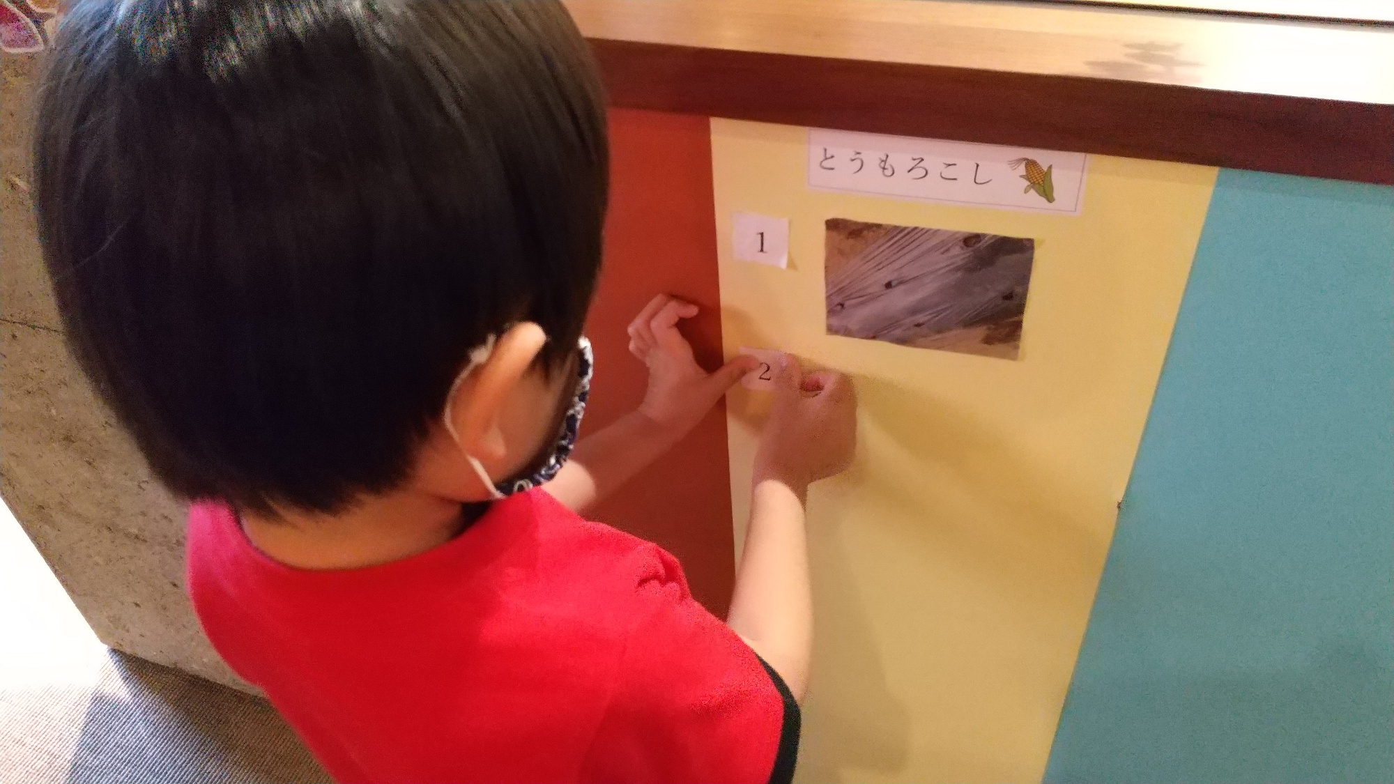 前回のグループ支援で植えたとうもろこしの種となすの苗の写真や、文字・数字を切って貼ります。誰が何を切るのか、のりはスティックのりとでんぷんのりのどちらを使うのか、順番はどうするのかなど、2人で話し合いながら一緒に1つのものを完成させました。