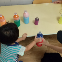 雨が降った時のように水を傘で受け止め、「ぽつぽつ」と水が当たる音やその感覚を楽しみました。