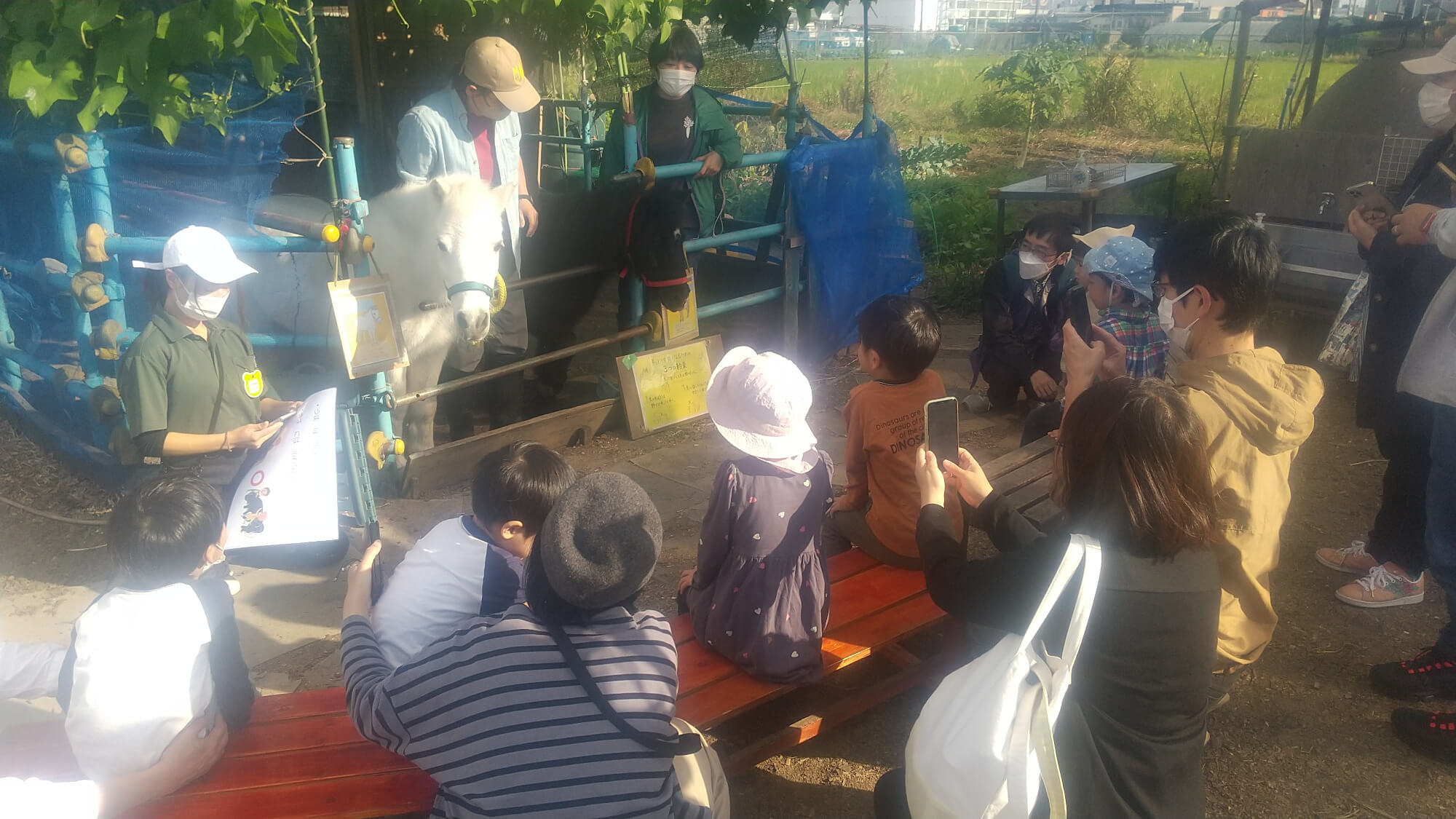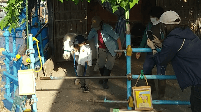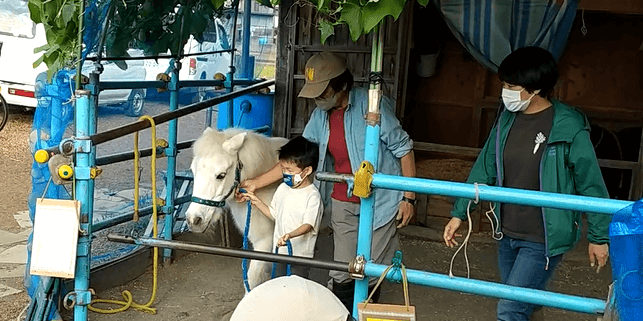 ホースセラピーでは餌をあげ、馬の家に入り手綱持ちながら馬とペースを合わせて散歩をします。「早く触りたい!」と言う子がいる一方で、緊張した表情を見せる子もいました。