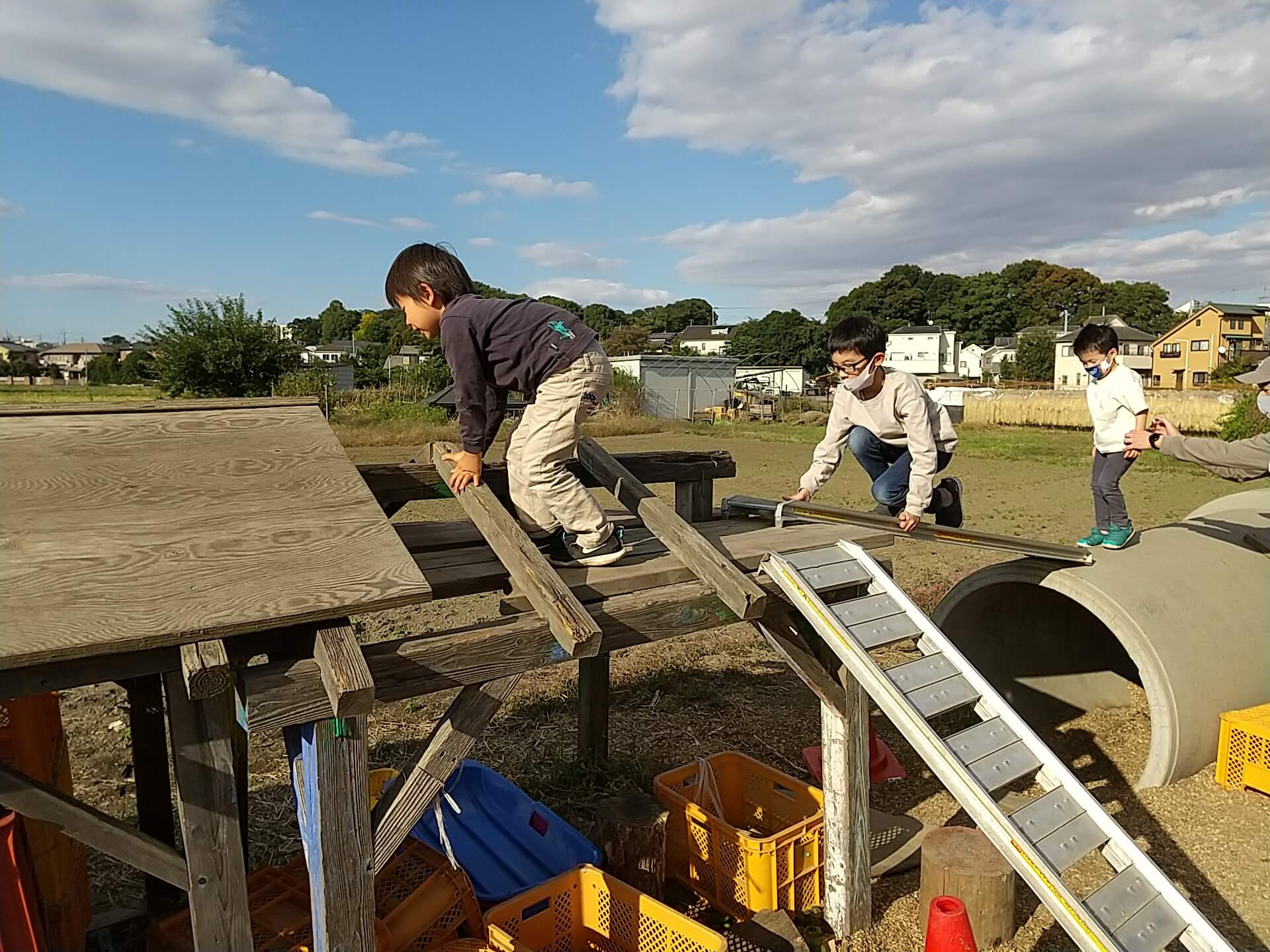 公園のアスレチックとは違い、どこから登るか、どこを持てばよいか、どうしたら体を支えることができるか、考えながら体を使う経験から、「できた」と嬉しそうな表情を浮かべる子どもたち。とても大きな自信に繋がったのではないでしょうか。