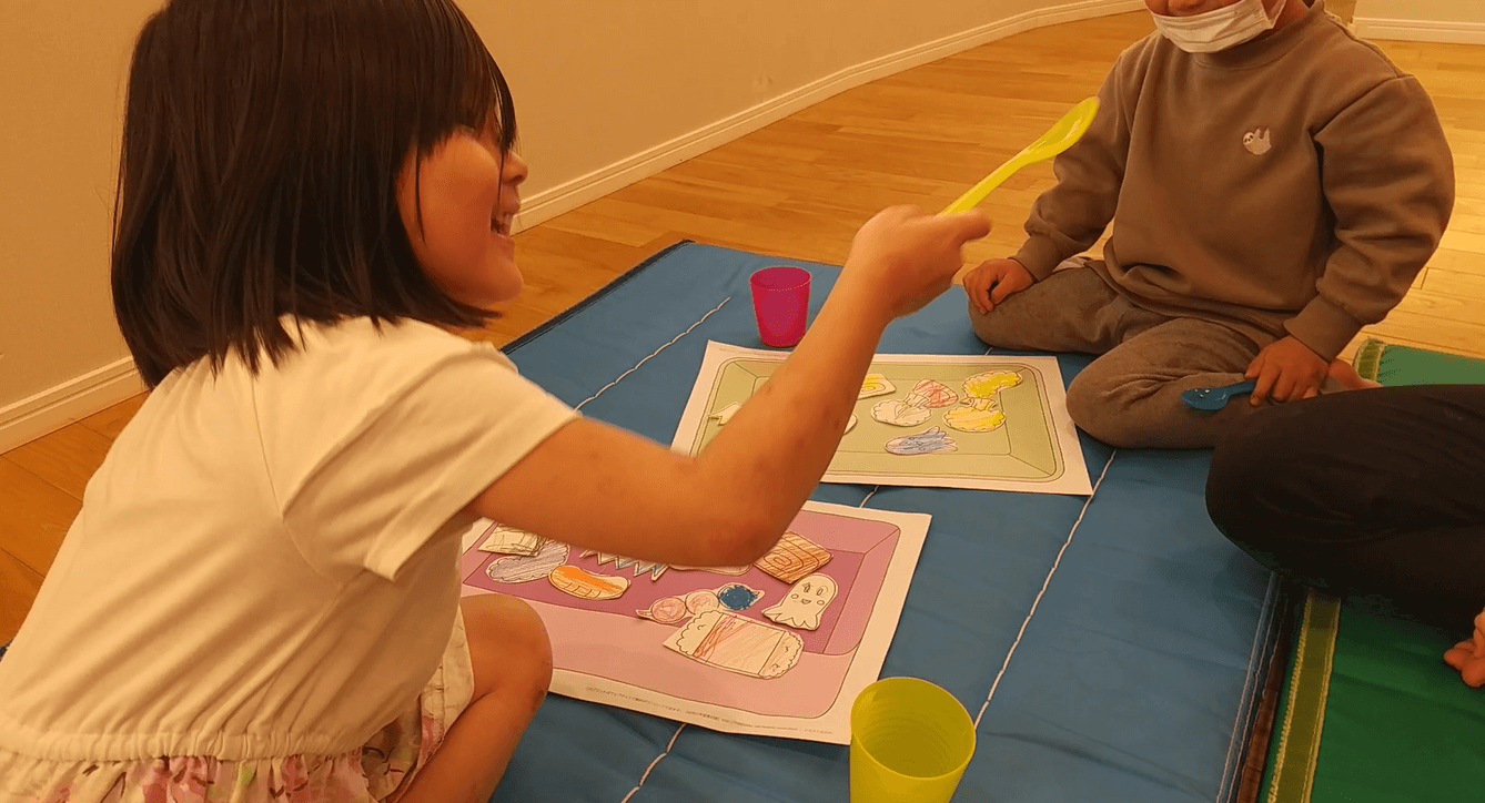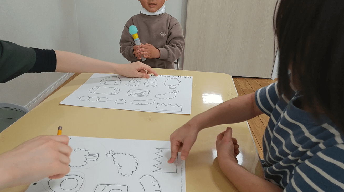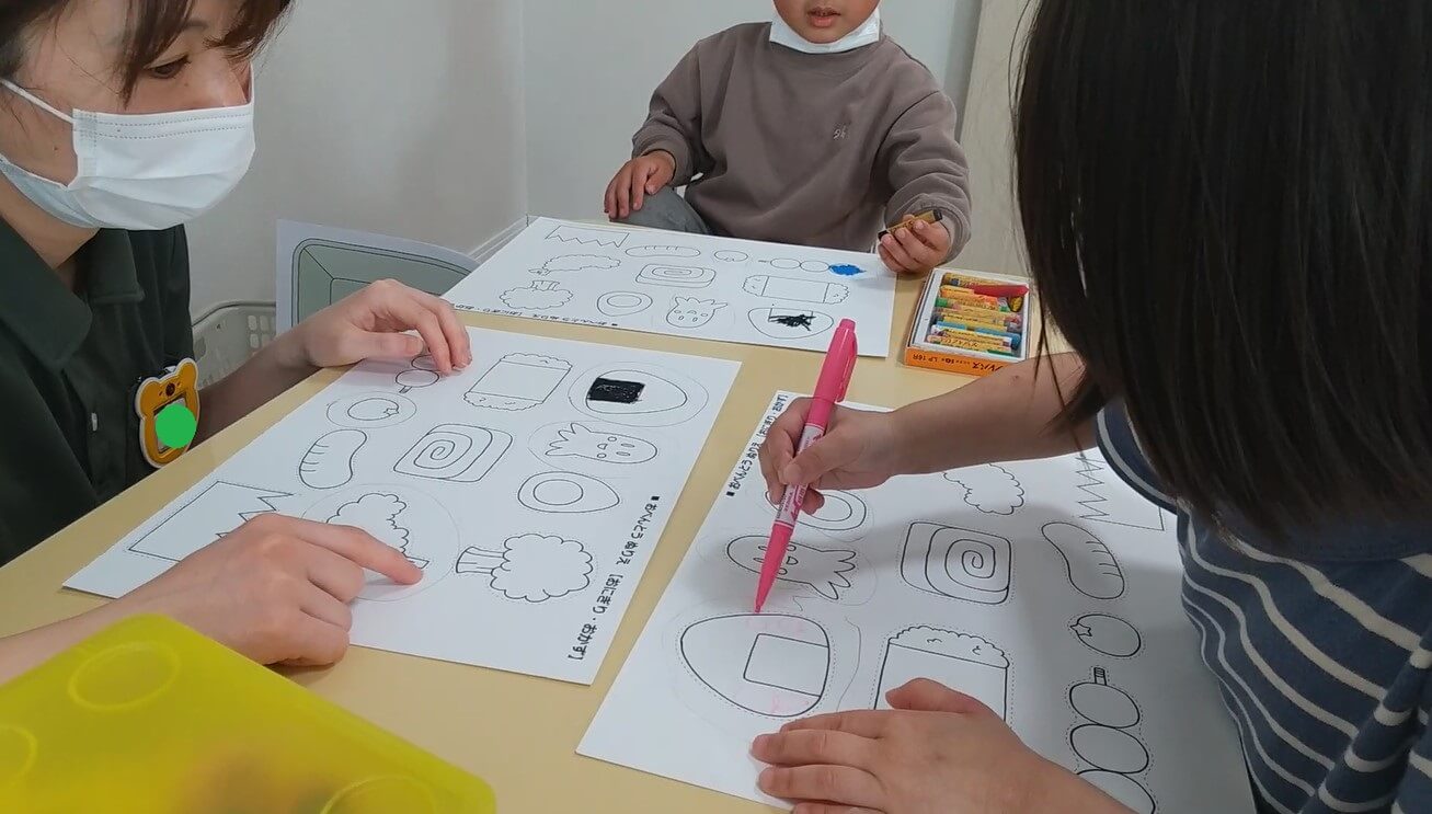 また、Aちゃんもそれまでのやりとりを受けて、同じようにBくんに質問をする姿が見られました。「たらこ」が良いとのことだったのでピンクのペンを使って丸を描き、たらこおにぎりを完成させました。