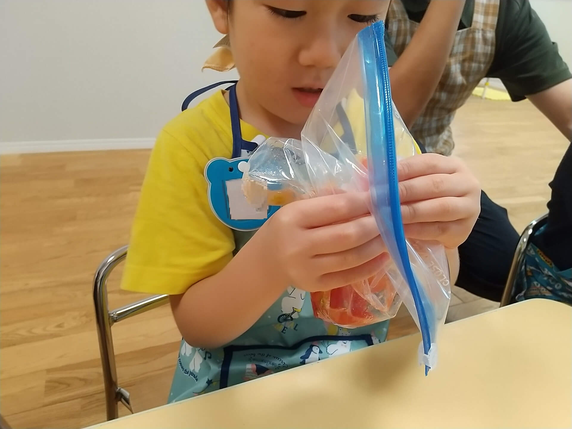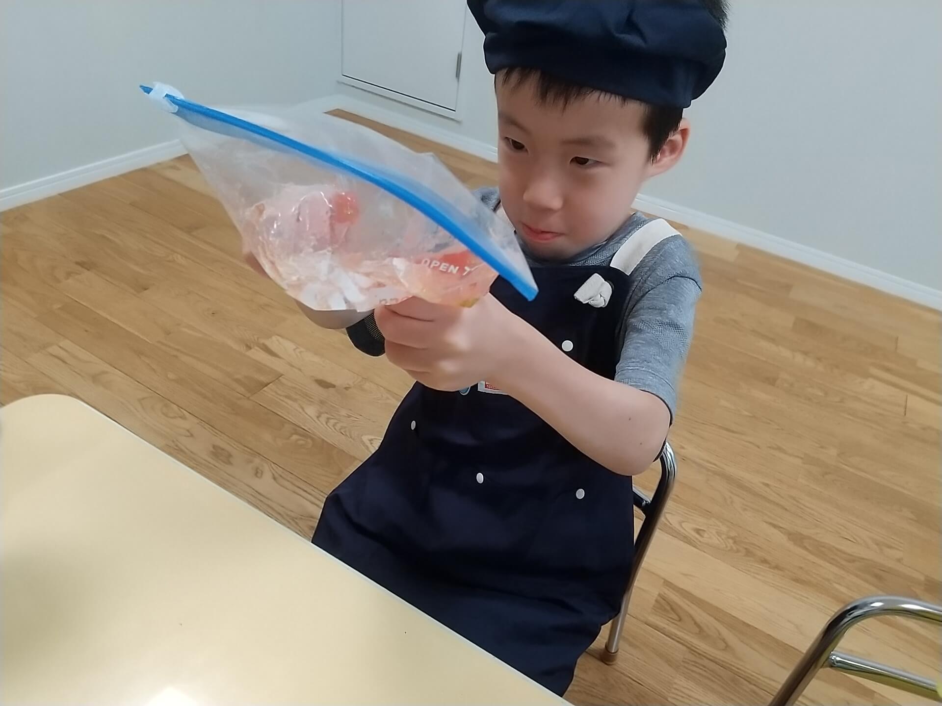次に、トマトをジップロックに入れて手で握ってつぶしていきます。はじめは感触が苦手な子もいましたが、スタッフから「トマト冷たいかな?」「固い部分あるか触ってみる?」などの言葉掛けを行うと、少し袋の上から触ってみて固い部分がなくなるように、指の感触を頼りに固い部分を探してつぶすことができました。