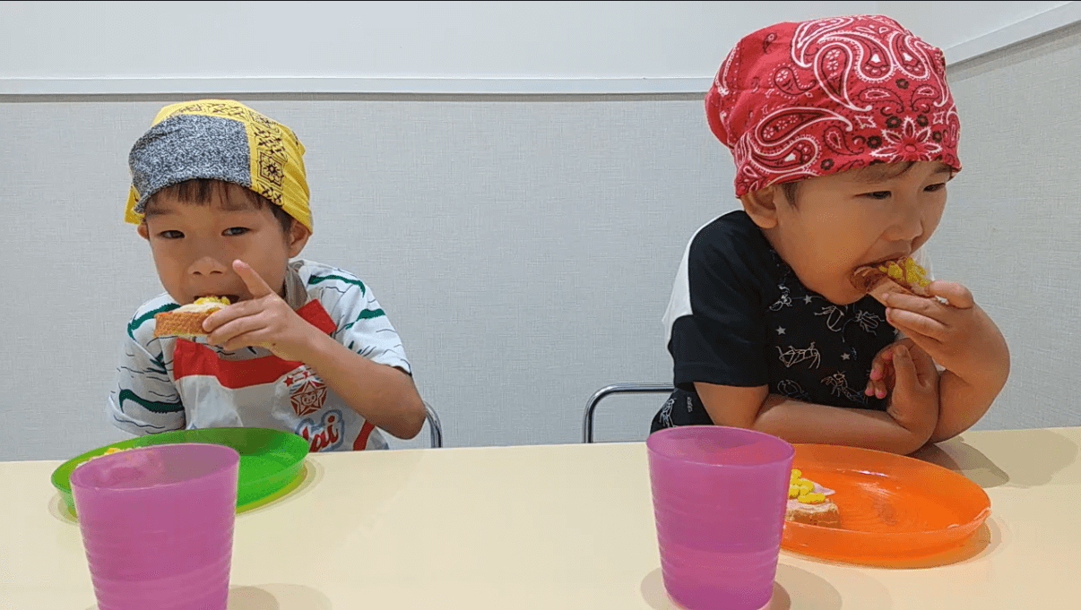 いざ実食です。普段初めて見たものを食べることは苦手な子が一口、また一口と食べることができた姿をみてスタッフも保護者の方も驚きました。自分で作ったことや、隣で友達が食べている様子をみたことが影響を与えたのかも知れません。
