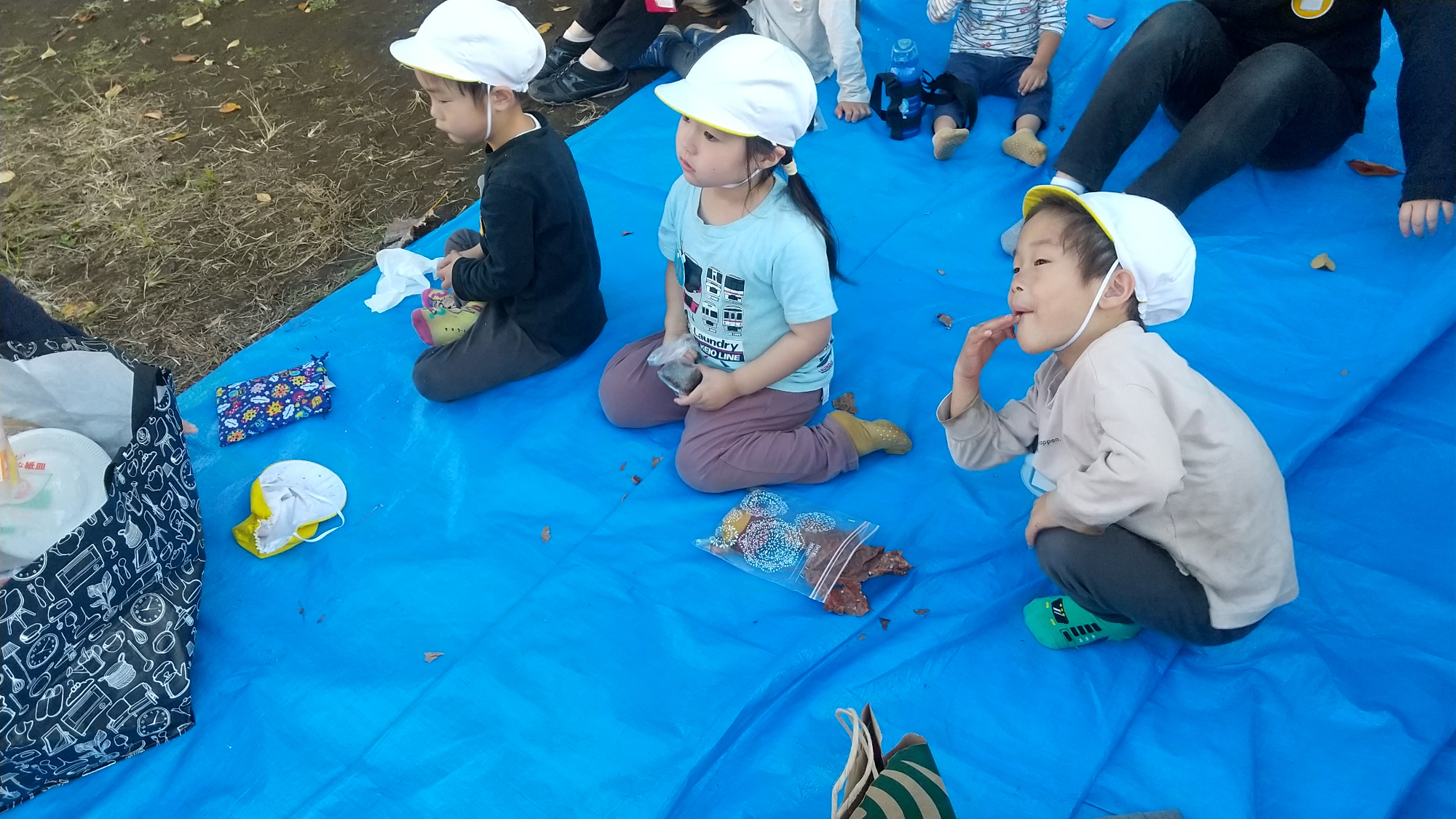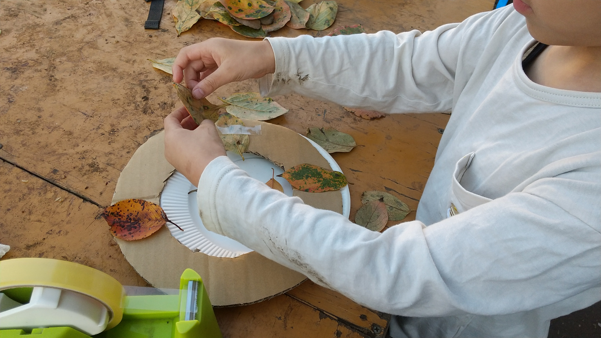後半は、自由遊び中に見つけてきた葉っぱや木の実を使い、秋の製作をしました。実際に自分で探し、見つけてきたものも使うことでより発想が広がり、リースを作る子もいれば時計を作る子、ピザを作る子など、みんなそれぞれ違った表現が見られます。