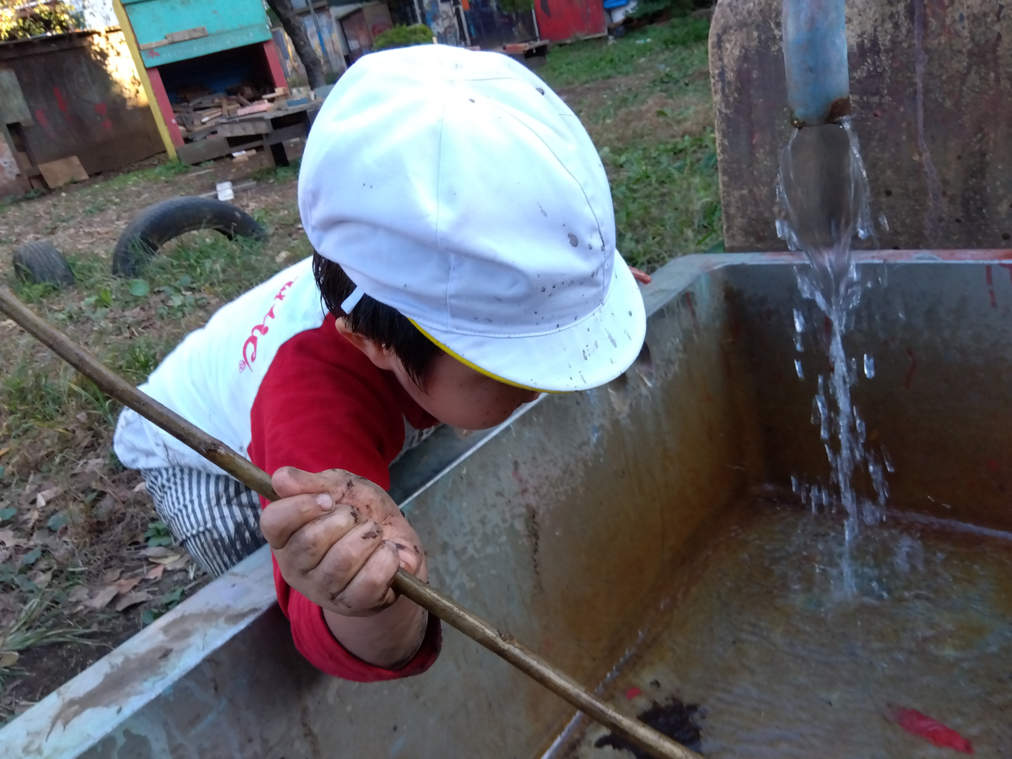 少しのきっかけがあれば遊び方は子どもたち自身でどんどん広がります。水汲みポンプの下に水が流れる場所を見つけて川に見立てて遊んだり、水たまりで枝を使って釣竿に見立て魚釣りをしたり、遊びにきている子の真似をして紙飛行機を折って飛ばして遊んだり、木の実が落ちている場所の抜け道を教えてもらったりしながら、公園内で遊んでいる子ども同士で自然と関わりが生まれていきます。
