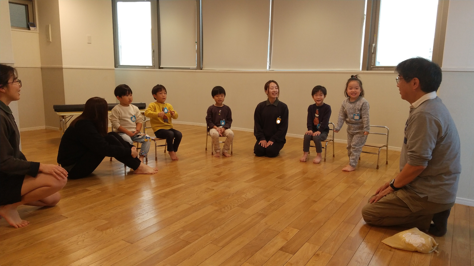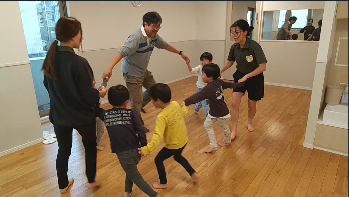 「サンタとトナカイゲーム」を終えて、次は子どもたちから高木さんへ「リズム体操」を教えてあげる番です。「トンボ」や「メダカ」、「こうま」や「糸車」では子どもたちと高木さんで手を繋ぎ、一緒にリズム体操を楽しむことができました。