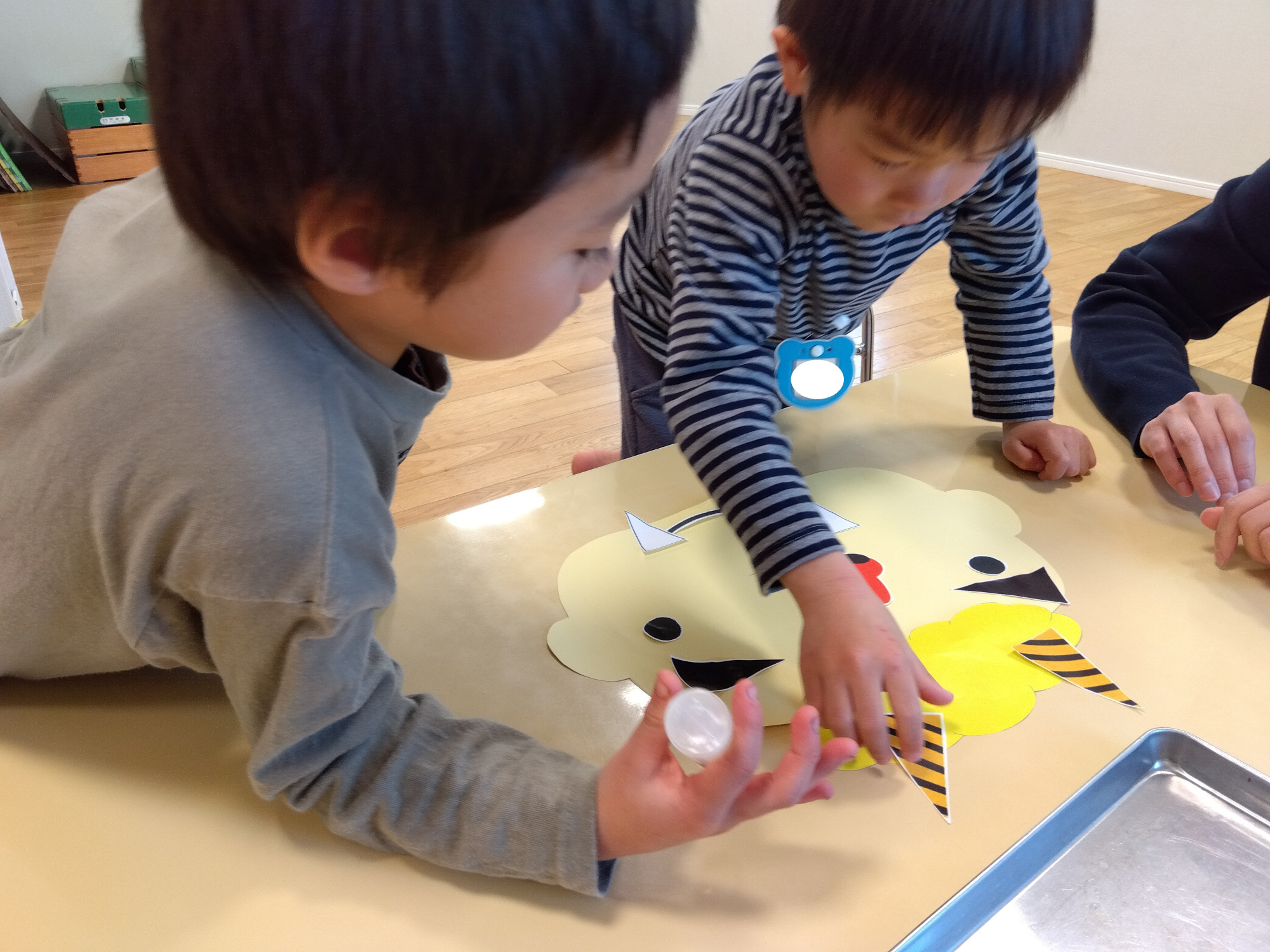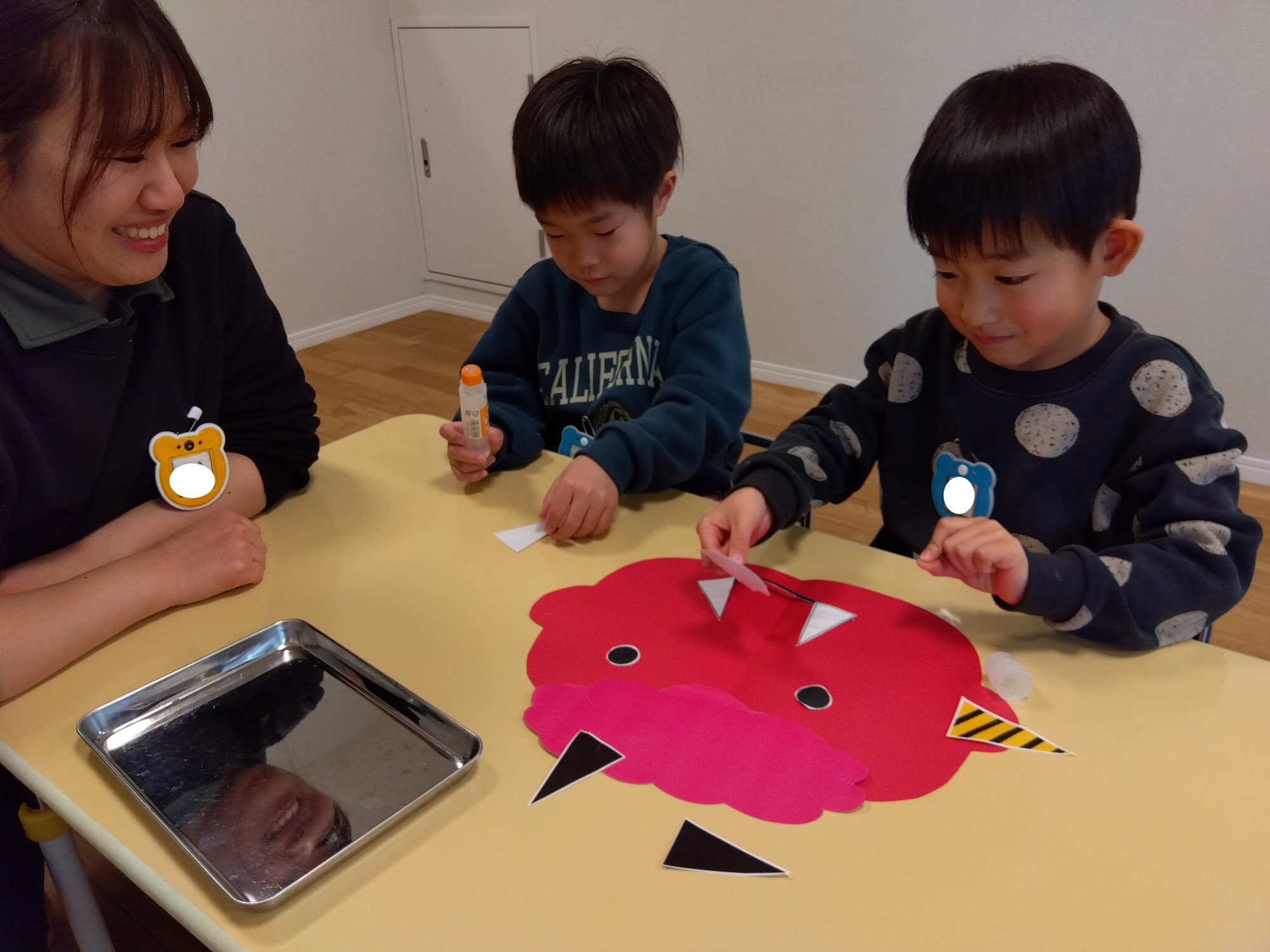 「鬼は黄色がいいな」「角は二本がかっこいいよ」「髪の毛は黄色かな」など友達と相談して決める機会増えるように、顔のパーツを複数用意することや、色を選択できるようにしています。