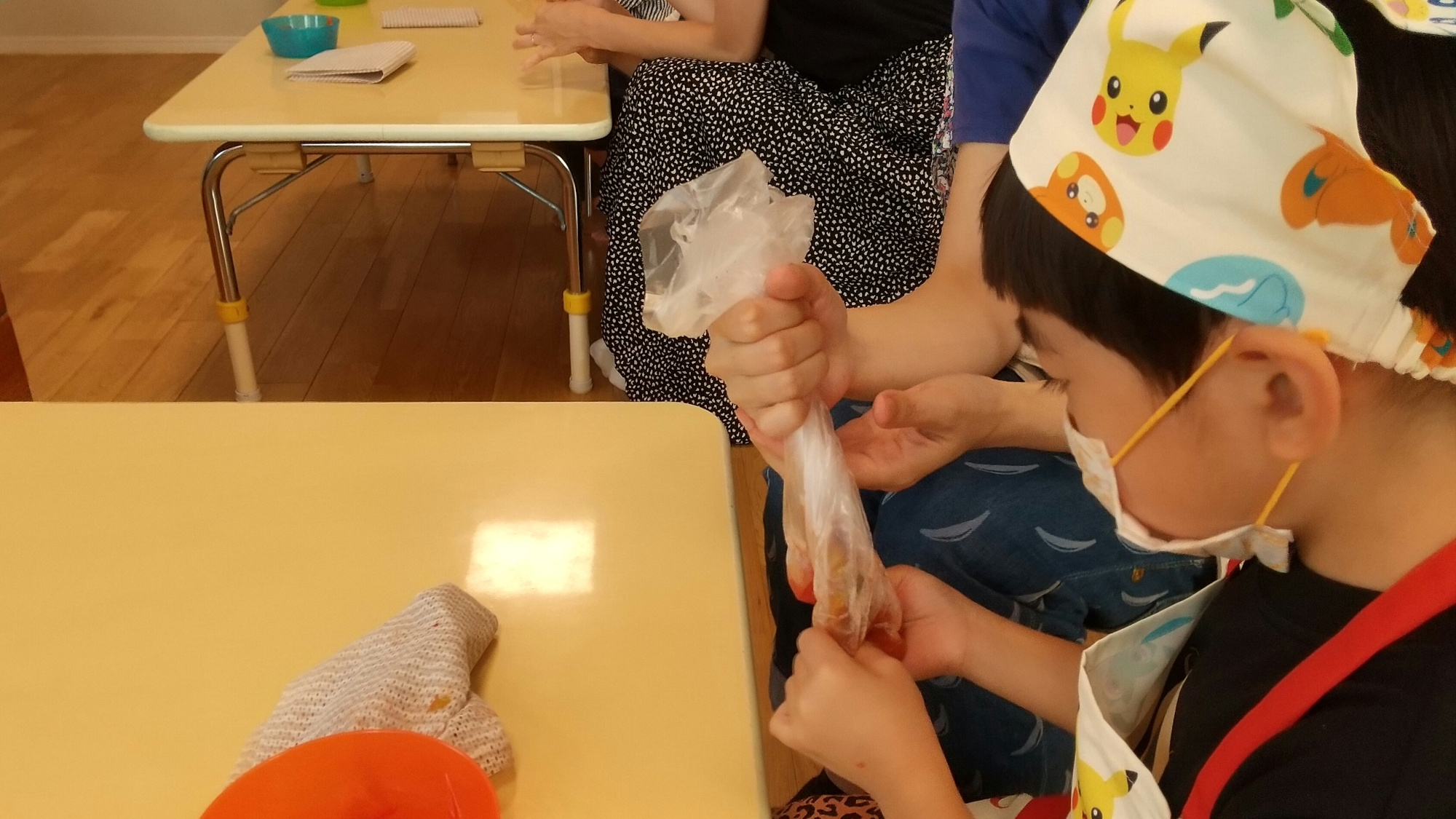 まずは袋に入ったトマトを潰します。潰す感覚が楽しくて夢中でトマトを握っている子や「冷たいね」と肌に感じる温度を楽しみながら触る子がいました。中には、「とまとの匂い、やだ~」と言っている子もいましたが、匂いが苦手な子は、袋に入れることにより潰すことに挑戦できた子もいました。