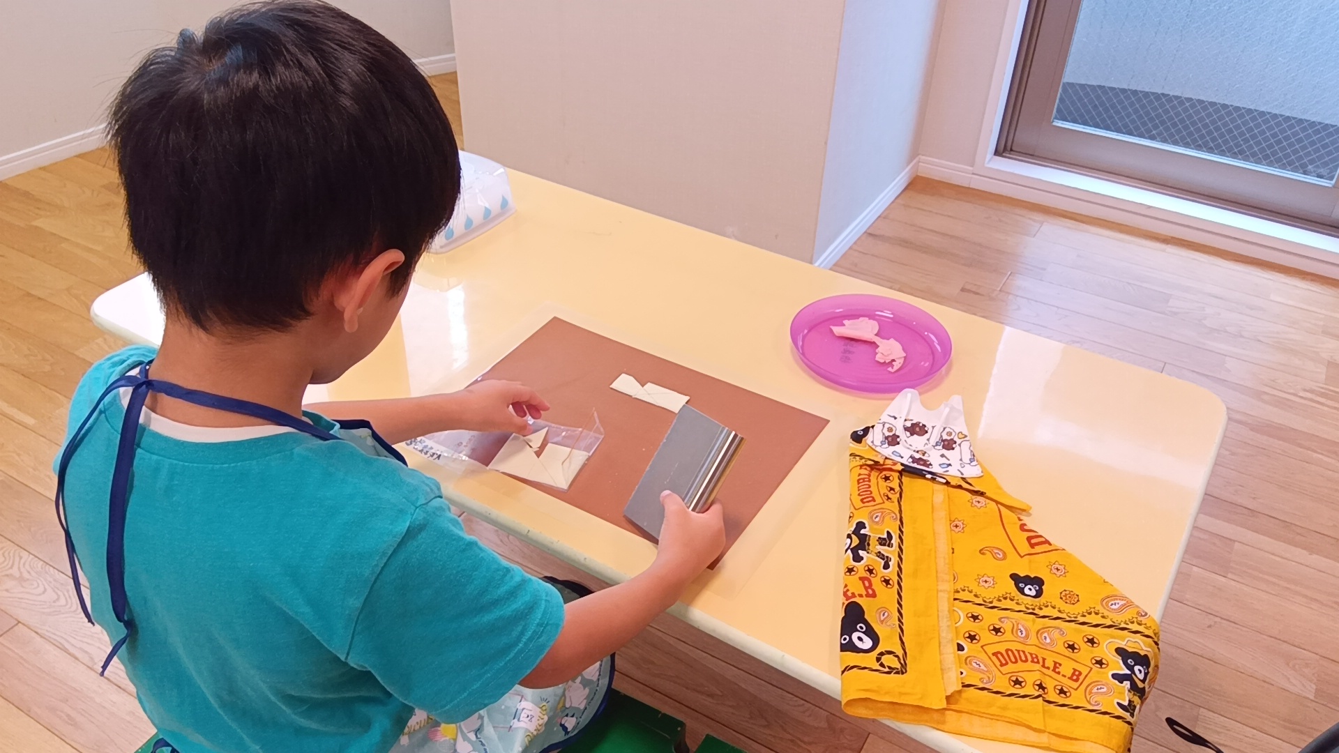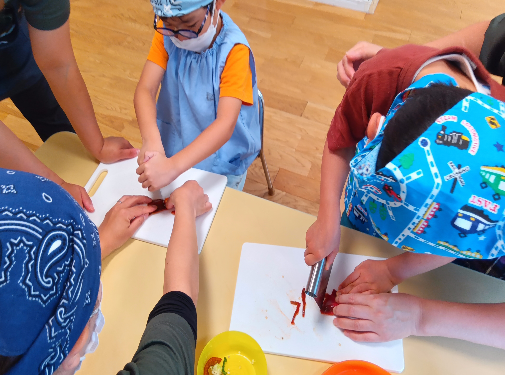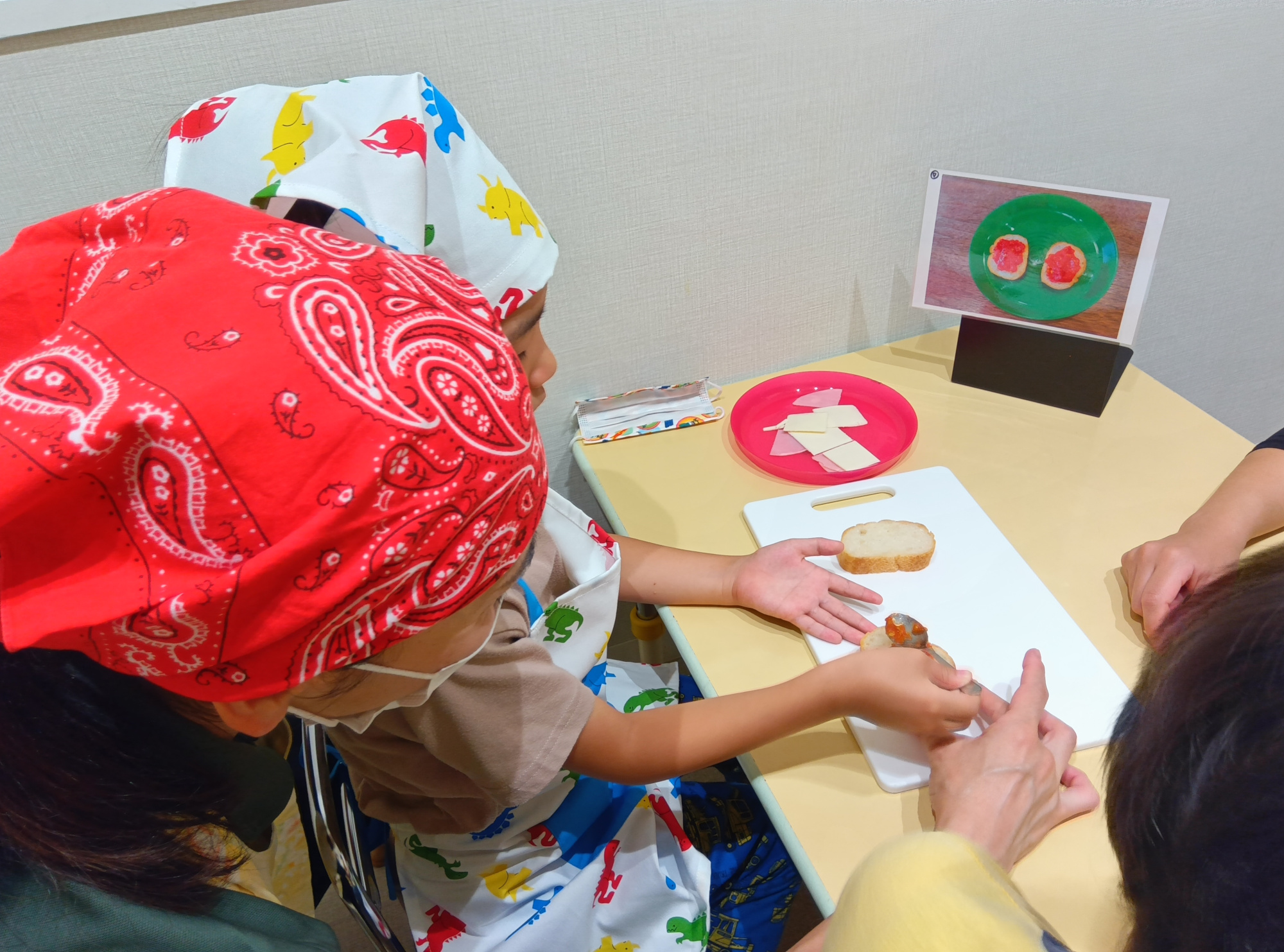 柔らかいハムとチーズで切る練習をします。どのように切ると良いかは写真をヒントに、自分で考えながら切ります。今回はスケッパーという道具を使い、ハムとチーズを切りました。初めて使う道具のため慎重に手に取り、使う子が多くいました。自分で切ることが初めての子も多くいたので、具材が切れた際は「できた」と、達成感を感じている子が沢山いました。