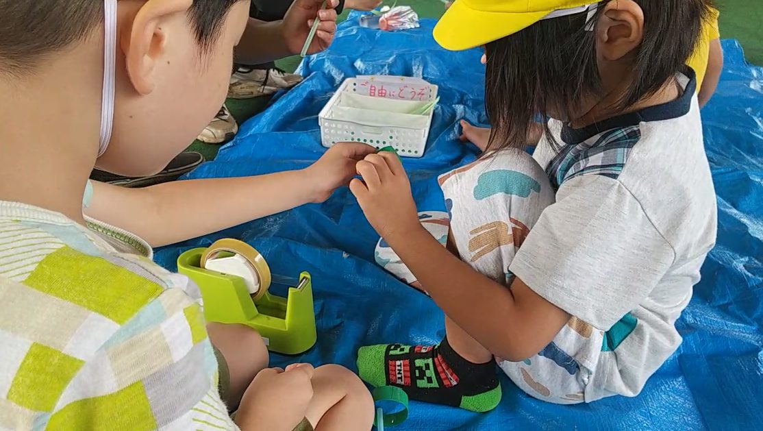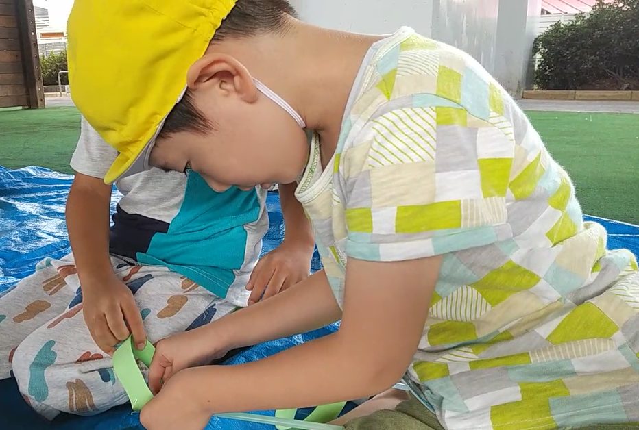 年中児はグループ支援の中で一度製作したことがあるため、急遽参加した年長児二人に作り方を教えてもらう役割をお願いしました。