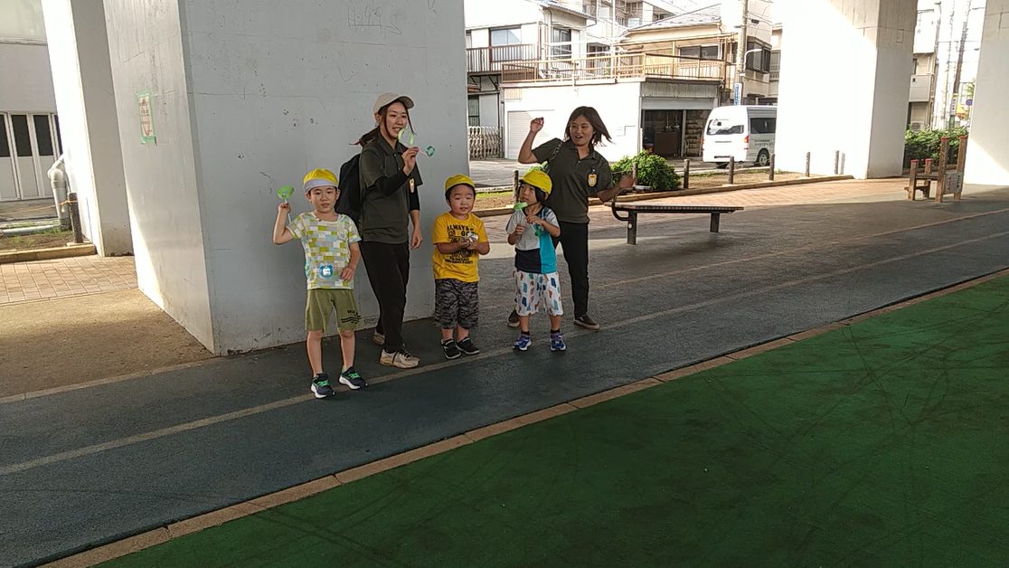 最後に作った飛行機を飛ばす際は、遠くに飛ばそうと頑張るがゆえに力が入り、振り切った先が下に向かうことやすぐに地面に落ちてしまうことも見られましたが、どうやったら前に飛ぶのか体の動かし方と飛ばし方のコツを伝えたり、子どもたちも考えたりしながら楽しく飛ばして遊ぶことができました。