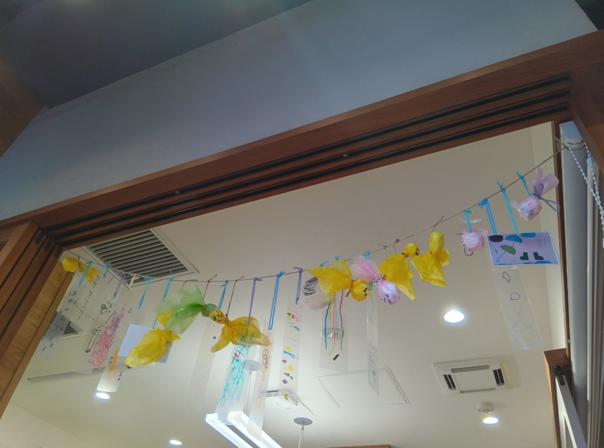「色は何色がいいかな?」「顔はどんな顔にしようかな?」と考えながらオリジナルのてるてる坊主を作り、カフェに飾りました。