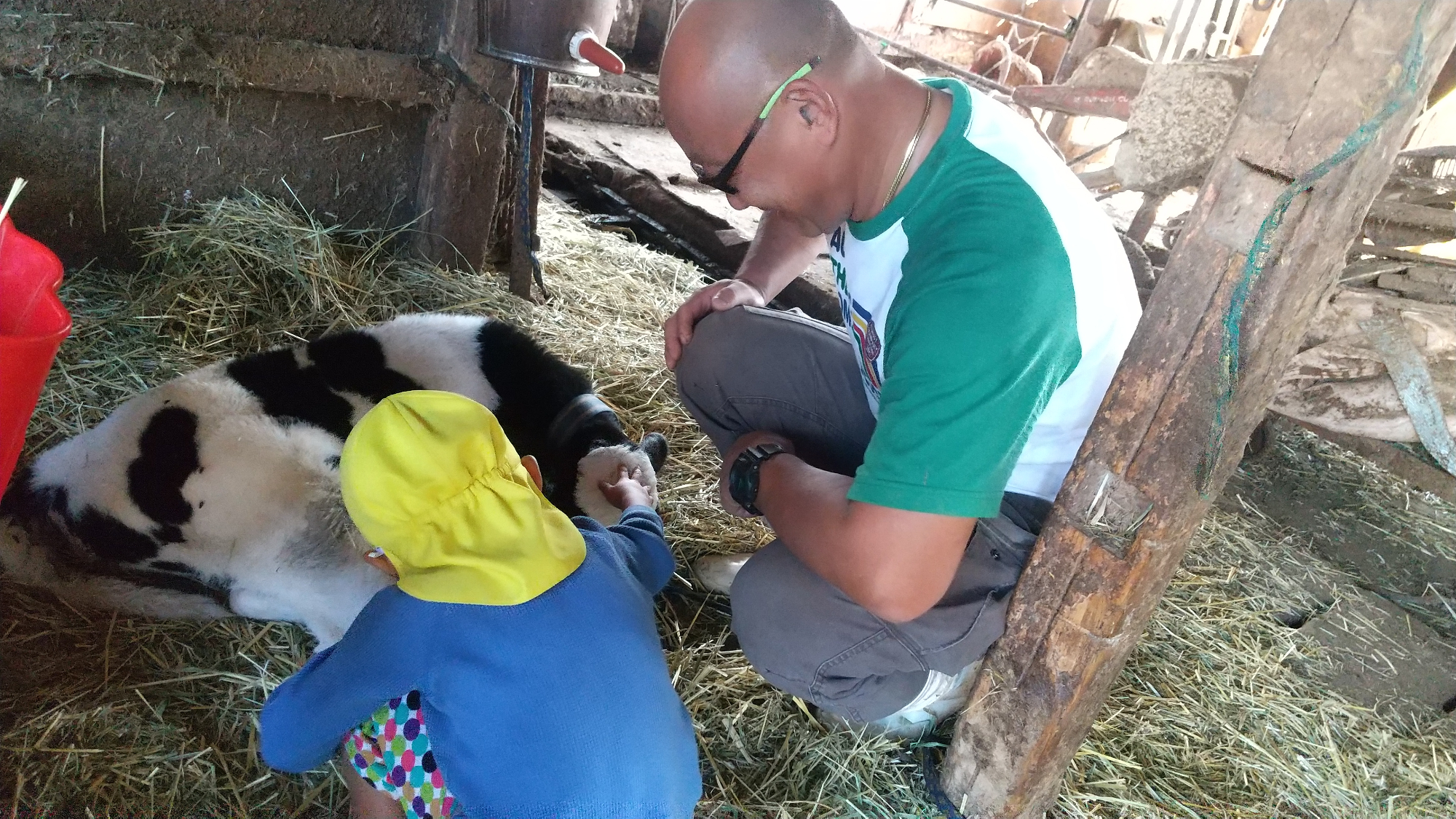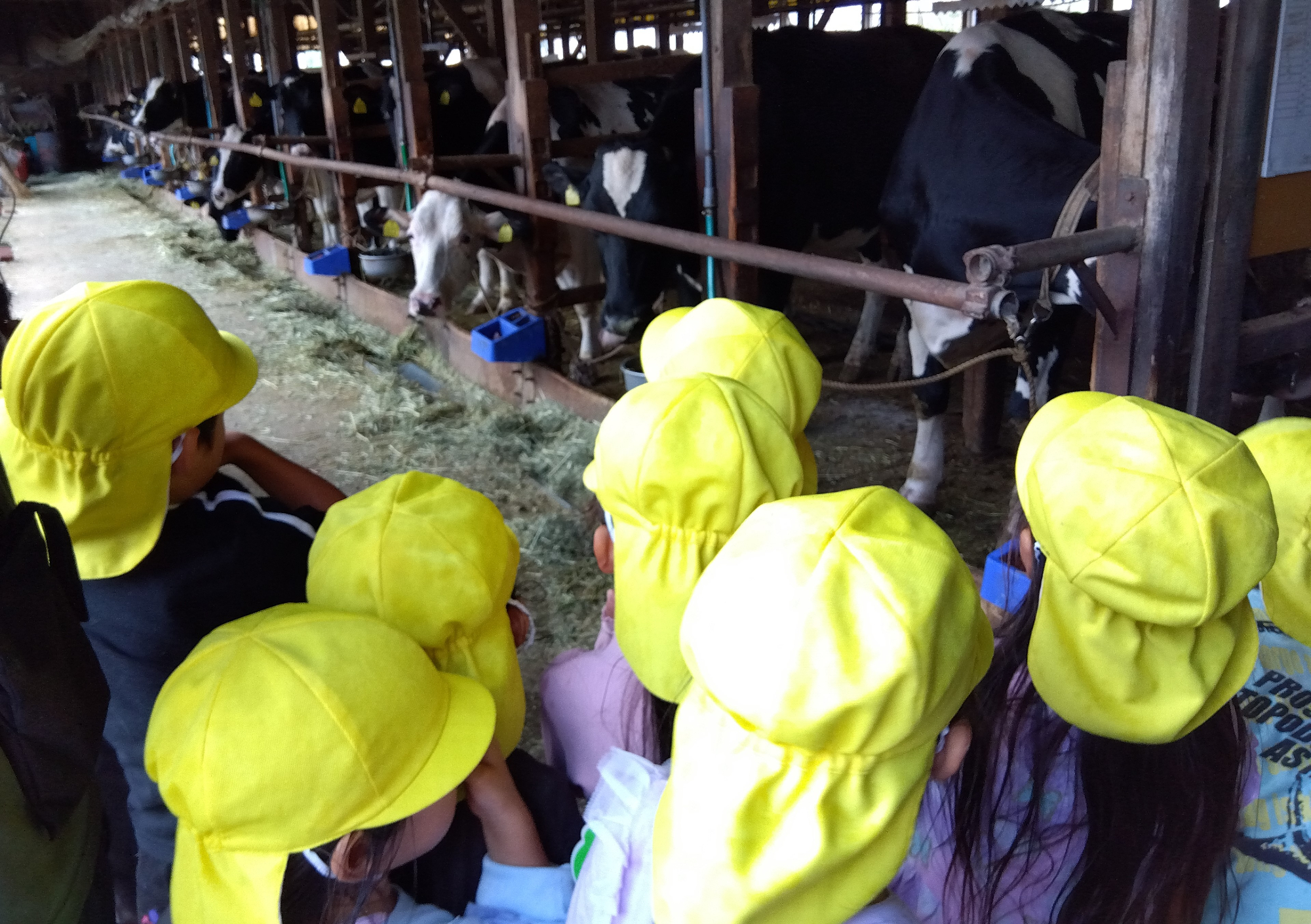 牛舎に入ると「かわいい!」「くさい!」「おおきい!!」「こわい」と自分自身の気づきを伝えて共有する姿がみられました。自然の中で視覚・嗅覚・触覚など感覚を養うことで脳の発育を促していくと共に、自身の安全・危険の判断が身につき挑戦するための土台が作られていきます。