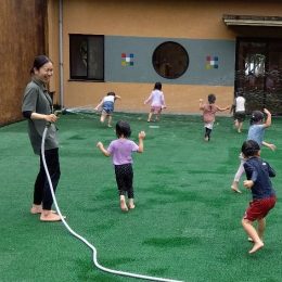 2025年1月、年長組を中心に1からつくりあげた畑には、現在、イチゴ、玉ねぎ、春菊、小葱、スナップエンドウの苗が育っています。1月には何もなかった畑ですが、今は小さな春菊の芽、長く伸びてきているネギ、つるが伸びてきているスナップエンドウ等、様々な野菜が、日々姿を変えて、私たちを楽しませてくれています。
