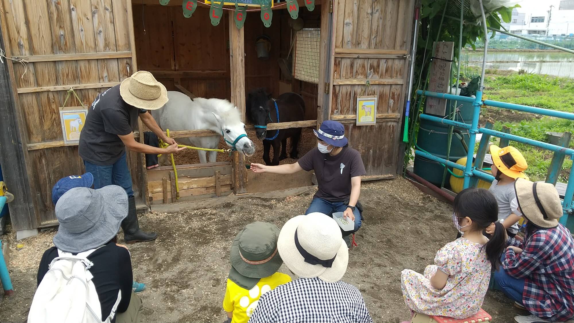 今回は、ジャックとダンディが柵から出てきて、みんなの前に登場。本物の馬を目の前にして、みんなで馬の塗り絵もしました。土管に登ったり、リヤカーに乗ったり、板をシーソーに見立てたり、おがくずと水をタライにいれて水遊びをしたりと、子どもたちが自分で遊びを見つけて、遊びを作って楽しんだ一日でした。