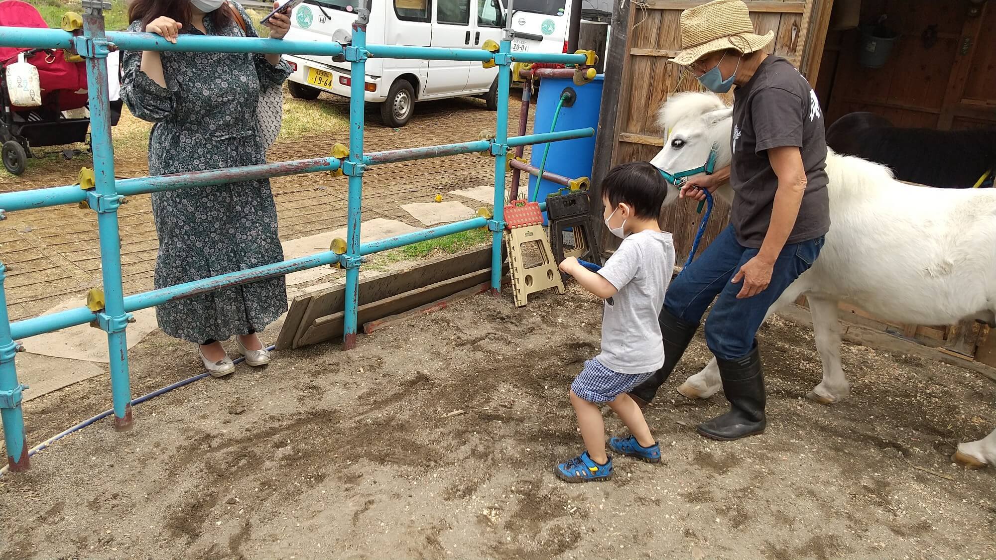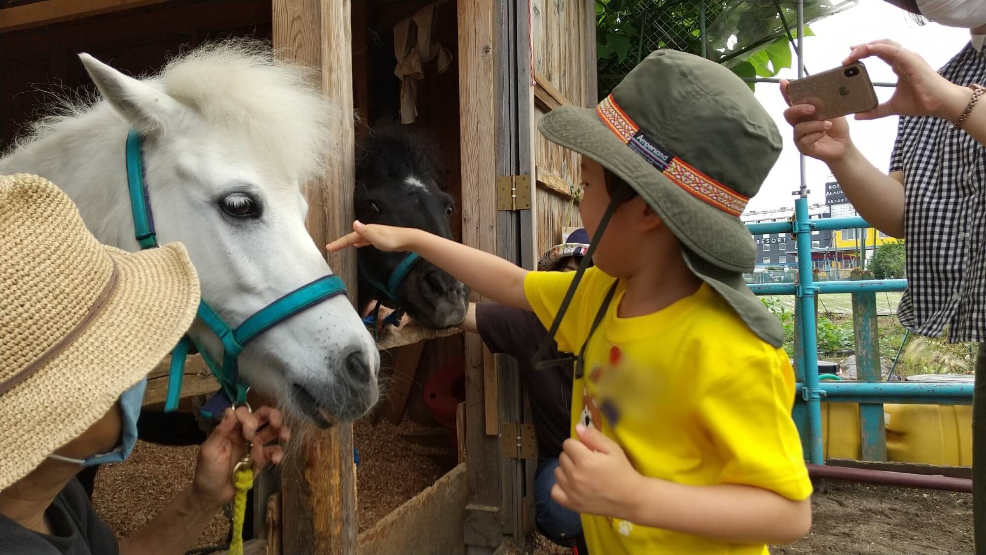 1人ずつ、ダンディにえさをあげました。元気に「エサだよ」と渡す子もいれば、ゆっくりゆっくりダンディに近づく子も。パクッとエサを食べた満足そうなダンディの鼻を、そーっとそーっと撫でたHくん。少し緊張しているのか、伸ばした指先にキュッと力が入っています。Hくんもママも、「お馬さんに触れた」ととても喜んでいました。