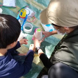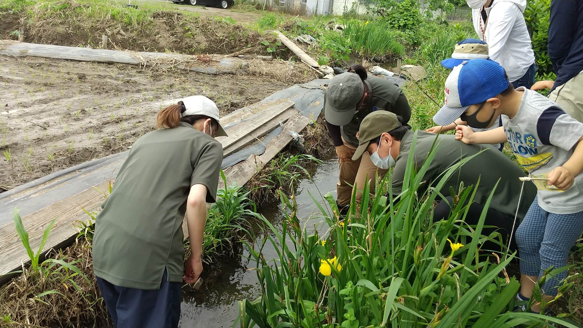 くにたち馬飼舎には水路があります。水路のそばでは、「えっ、何?」「ここかな?」「いた?」「分かんないな~」「消えた?」といった会話が飛び交っていました。「カエル、いた!」との職員の一声で、みんなの視線は水路の中。しかし…カエルの瞬発力に人間のカエルを探す力は及びませんでした。この日はザリガニも捕れず、ザリガニを入れるために用意してきた虫かごには、ちょうちょうの姿がありました。