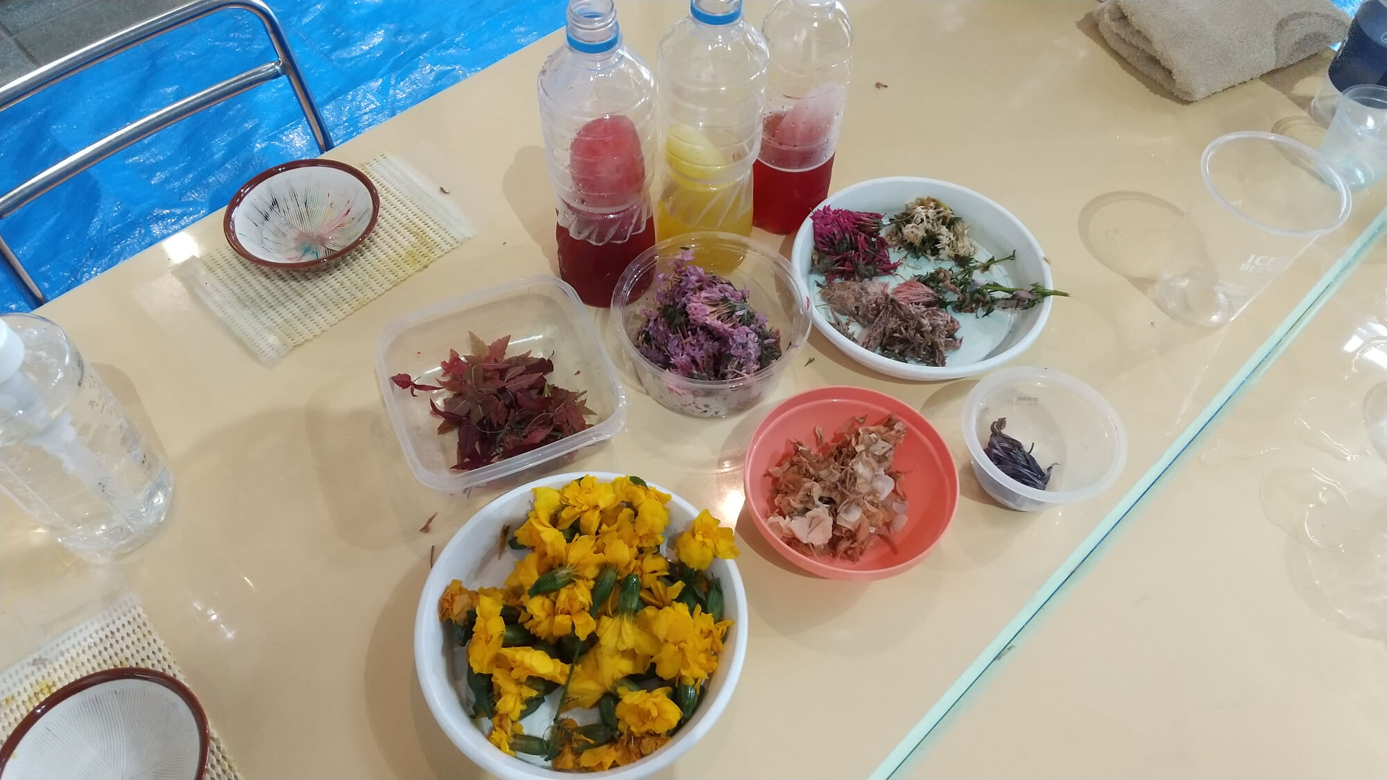 赤色のボトルはビーツ、黄色のボトルはマリーゴールドです。どちらも色鮮やかで、子どもたちは「ぶどうジュースみたい」「いいにおいがする」と言っていました。
