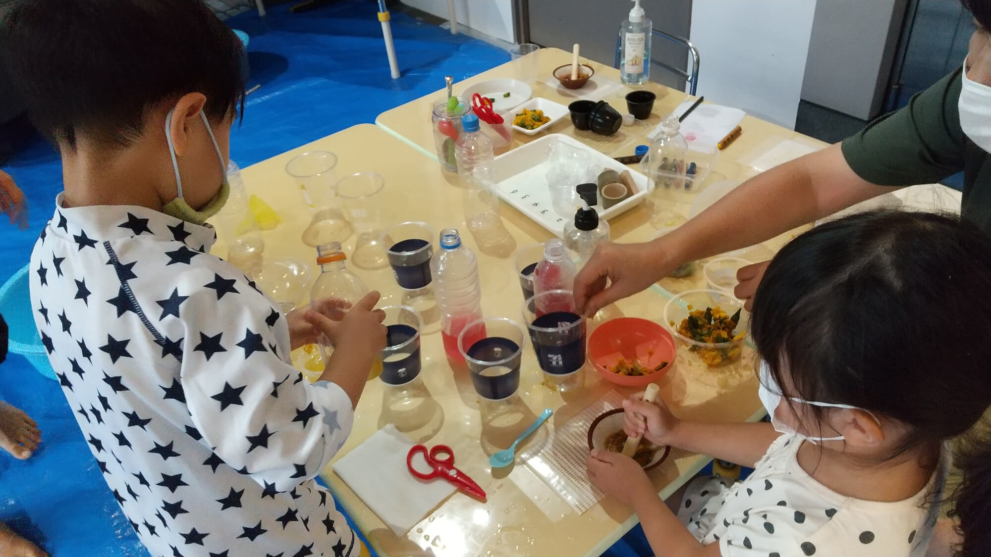 昨年の「水deあそぼう」では、食紅を使って色水を作りました。今年は、畑で取れた野菜と花などを使って色水づくりを行いました。