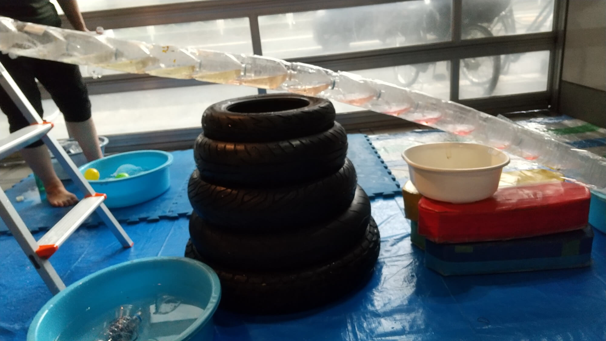 子どもたちは、花で作った色水をペットボトルでつながっているトイに流します。