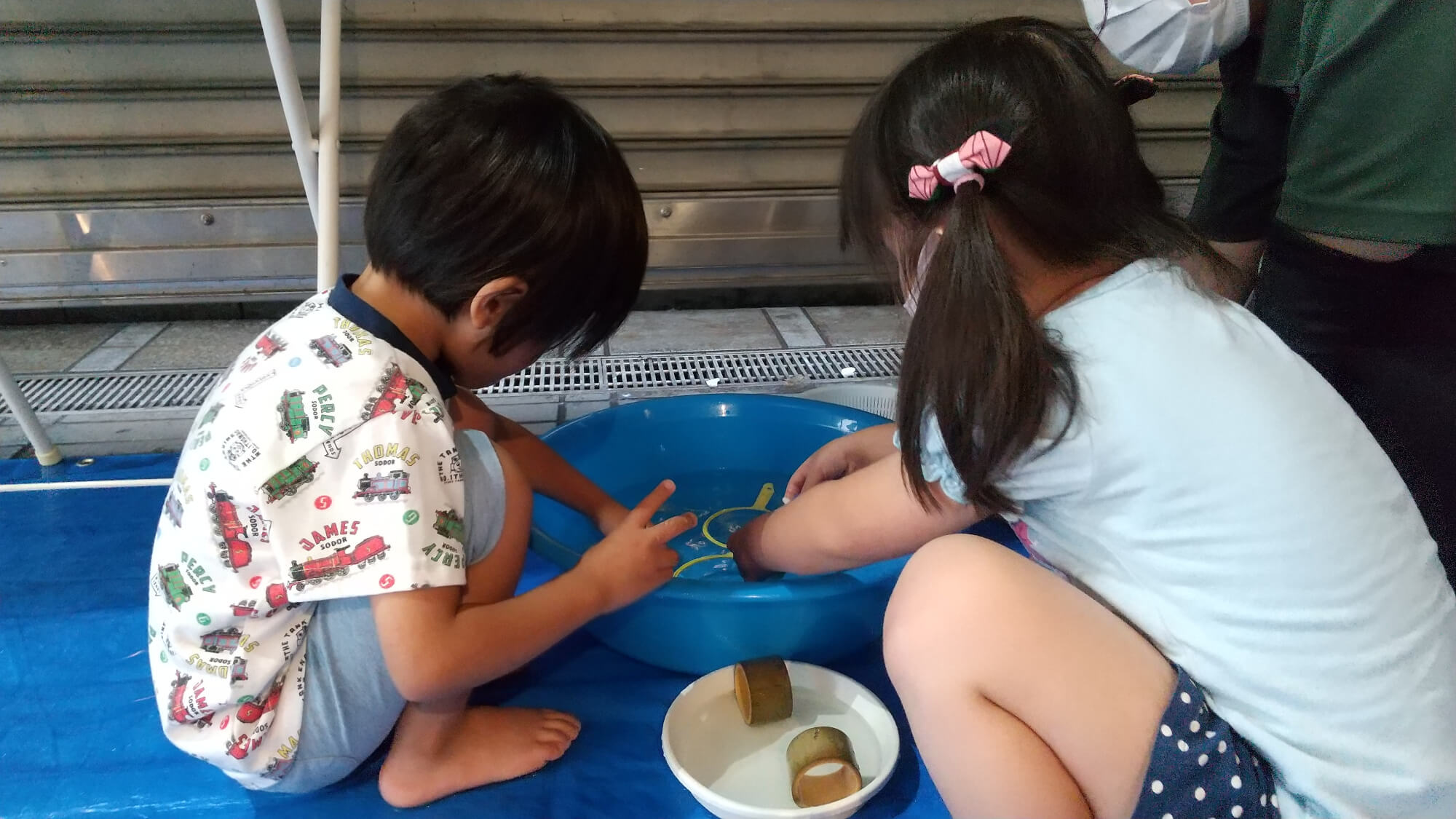 ここは、カメすくいコーナーです(もうカメはいません)。あれ?よーく見ると、これは・・・竹の筒です!半紙が破れないよう、集中して竹の筒をすくう姿がありました。