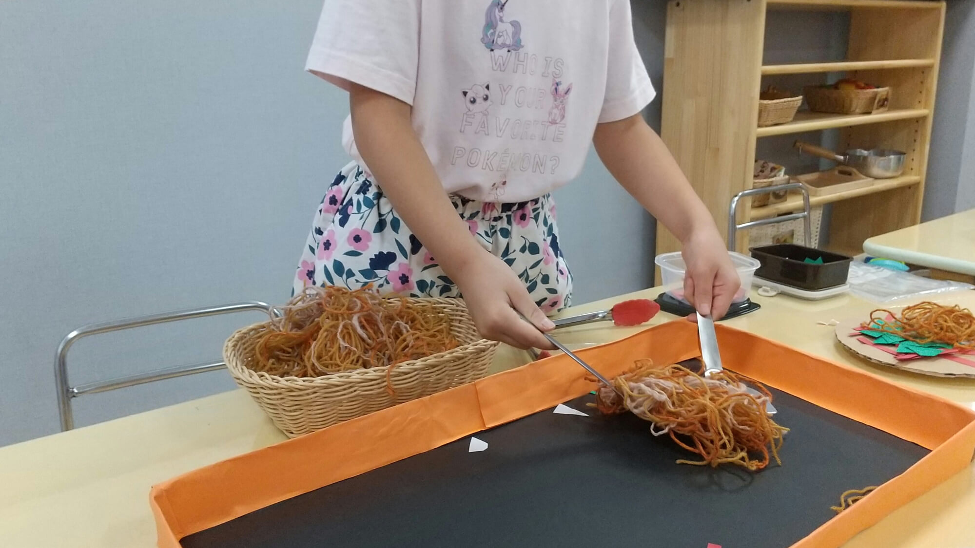 まずは食材づくりです。 画用紙やカップ、毛糸などを使って「(焼きそばの麺)どのくらいがいいかな?」「アイスは何味にしようかな」など、イメージしたものを集中して作っていました。「わたあめ屋さんやりたい!」「おもちゃ屋さんは?」などのリクエストもありました。 みんなのアイディアが集まったオリジナルの「ミニ夏祭り」ができました 。