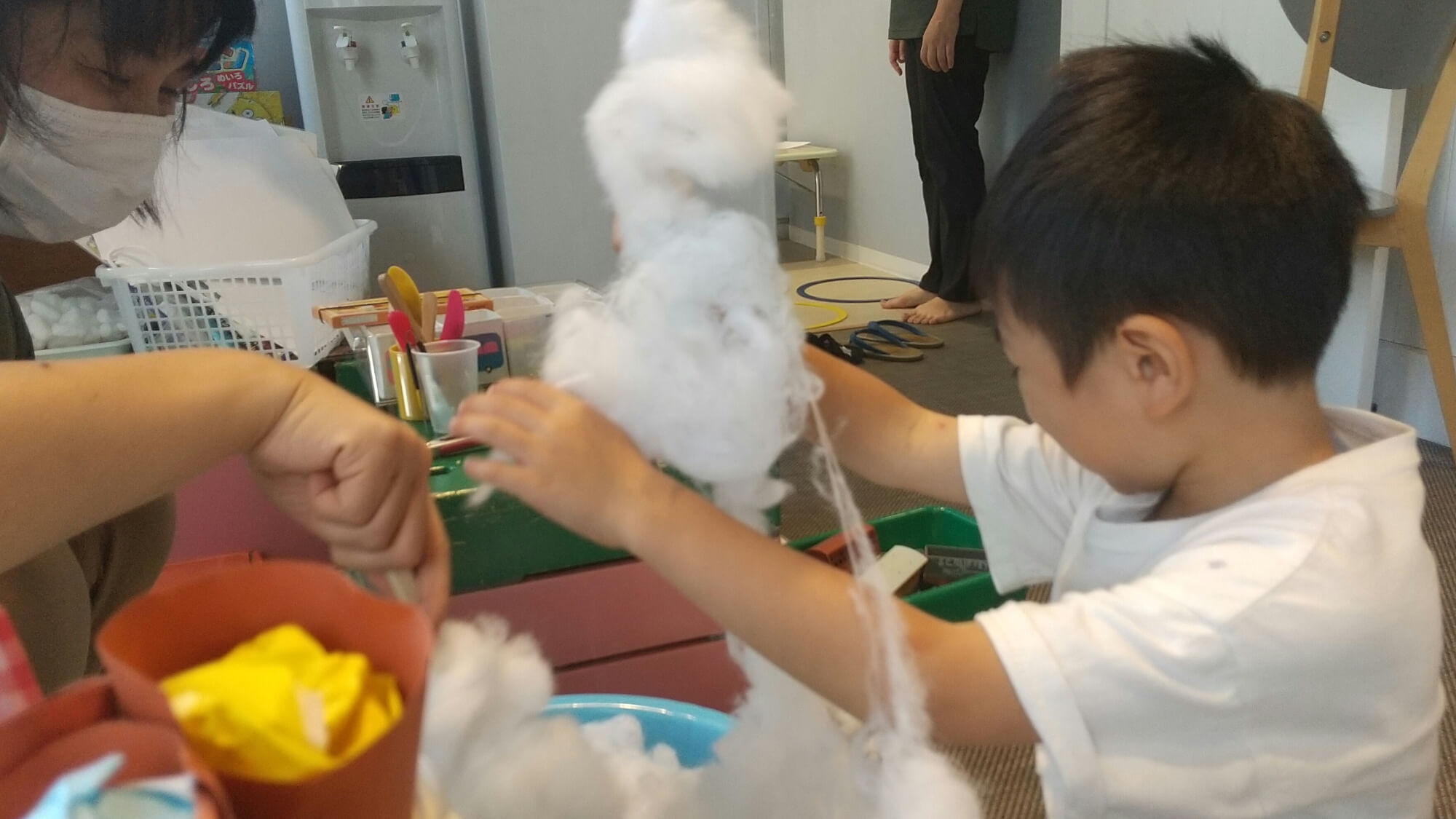 フワフワのわたあめがあります。 手でぎゅっと握ってみたり伸ばしてみたり。あれれ。よく聞いてみると 「冬になりました。雪が降ってきた! 」「電車で運びます」の声が聞こえてきます 。 Rくんは雪に見立てていました。春夏秋冬に絡めながらイメージしたものを言葉で伝える姿がありました。
