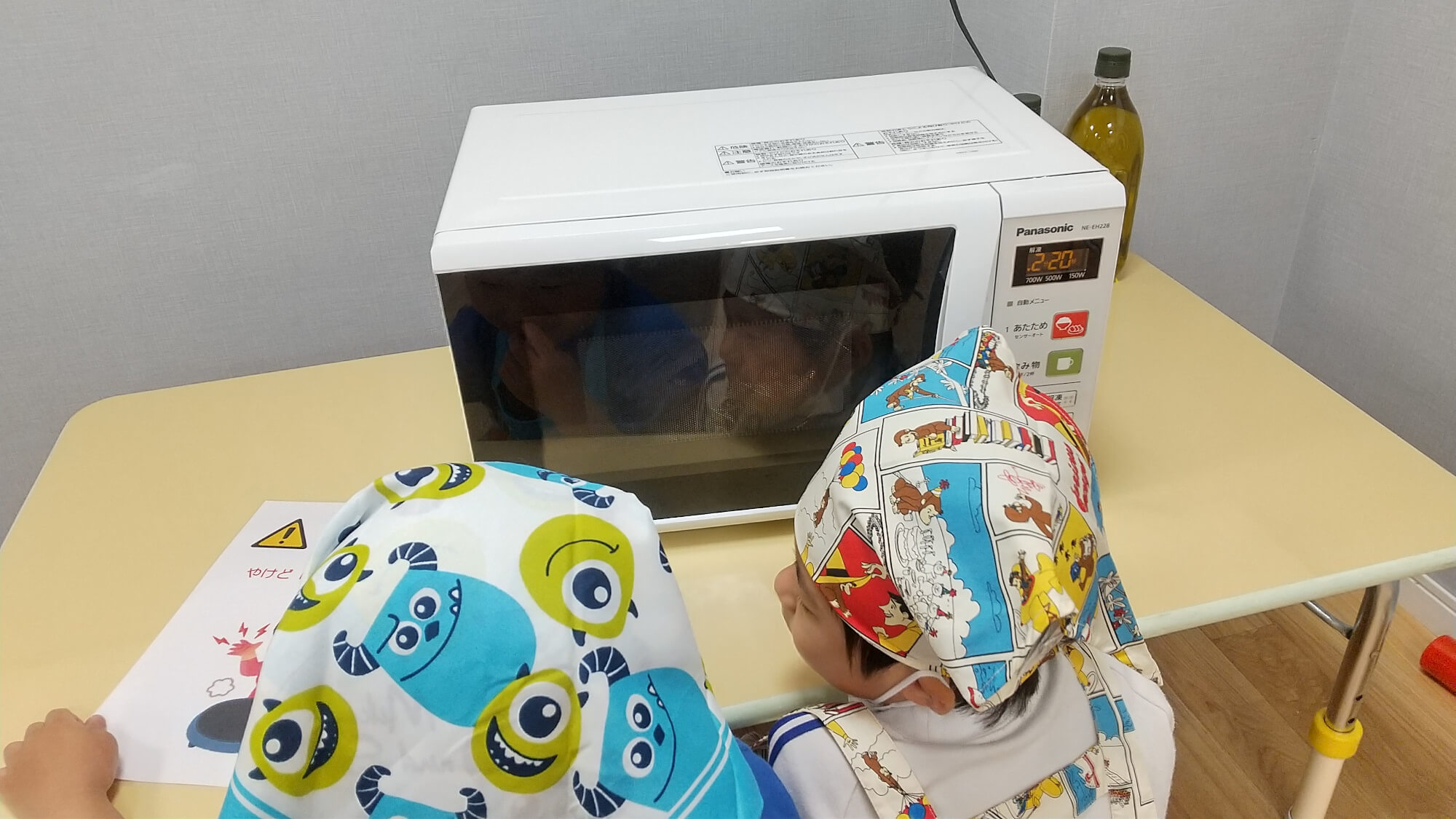 「ぐるぐる回っているね」「いいにおいがしてきたね」電子レンジを見つめる子どもたちからはこんな会話が聞こえてきました。