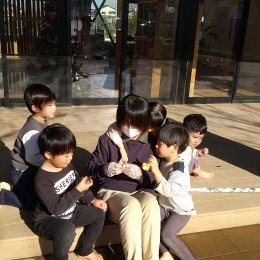 「ちょうちん」を作りました。画用紙にハサミで切り込みを入れ、丸めたら完成です。イラストを描き、シールを貼り、オリジナルのちょうちんを作る子どももいました。ハサミを使う順番待ちをする中で、「貸して」「いいよ」などのやり取りを見ることができました。完成したら、飾る場所も自分で決めて壁に貼りました。