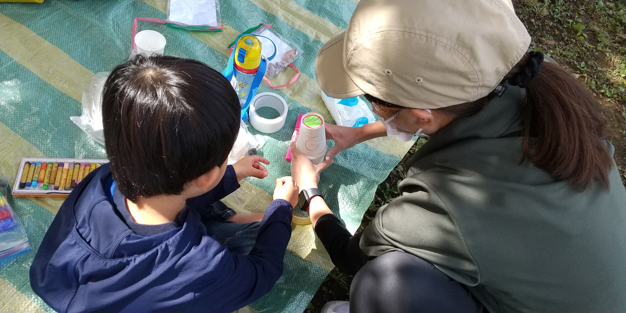 工作では、どんぐりマラカスや、どんぐり山を作りました。「きれいな音がするよ」と友達や職員とともにどんぐりマラカスを振り演奏会を開いたり、「もっとどんぐりを集めたい」とどんぐりを集めて山を大きくしたりと、広い公園の中でのびのびと遊ぶことを目一杯楽しんでいました。
