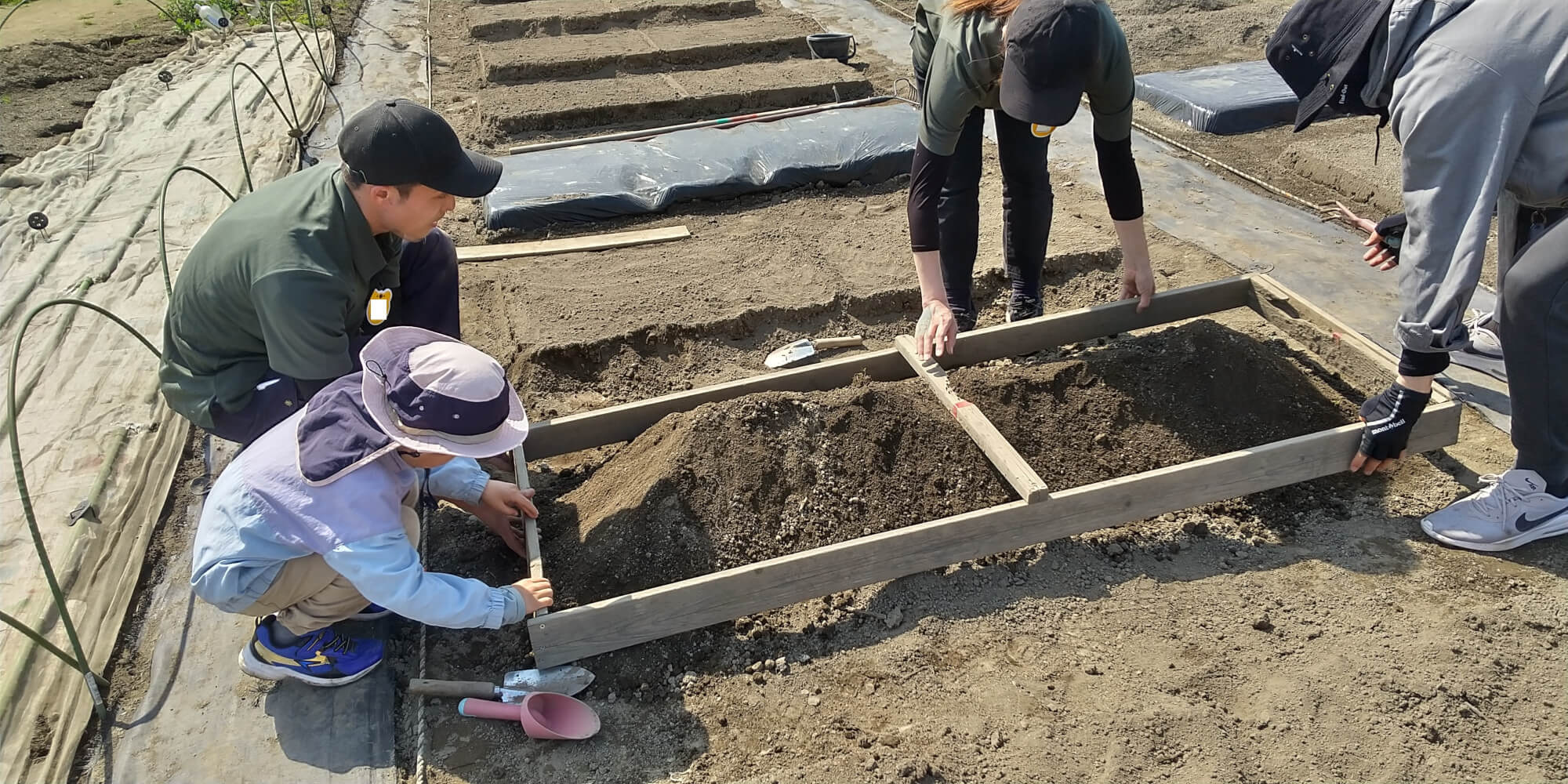 畝づくりは1人では難しく、協力が必要な作業です。「これでいいかな?」「まだだよ」「いいよ」など、子どもも大人も一緒に考え、やりとりしながら畝を作っていきました。保護者の方も一緒になって畑仕事を経験することで、大変さや楽しい気持ちを子どもたちと分かち合えるといった、畑の醍醐味を感じることができたのではないかと思いました。