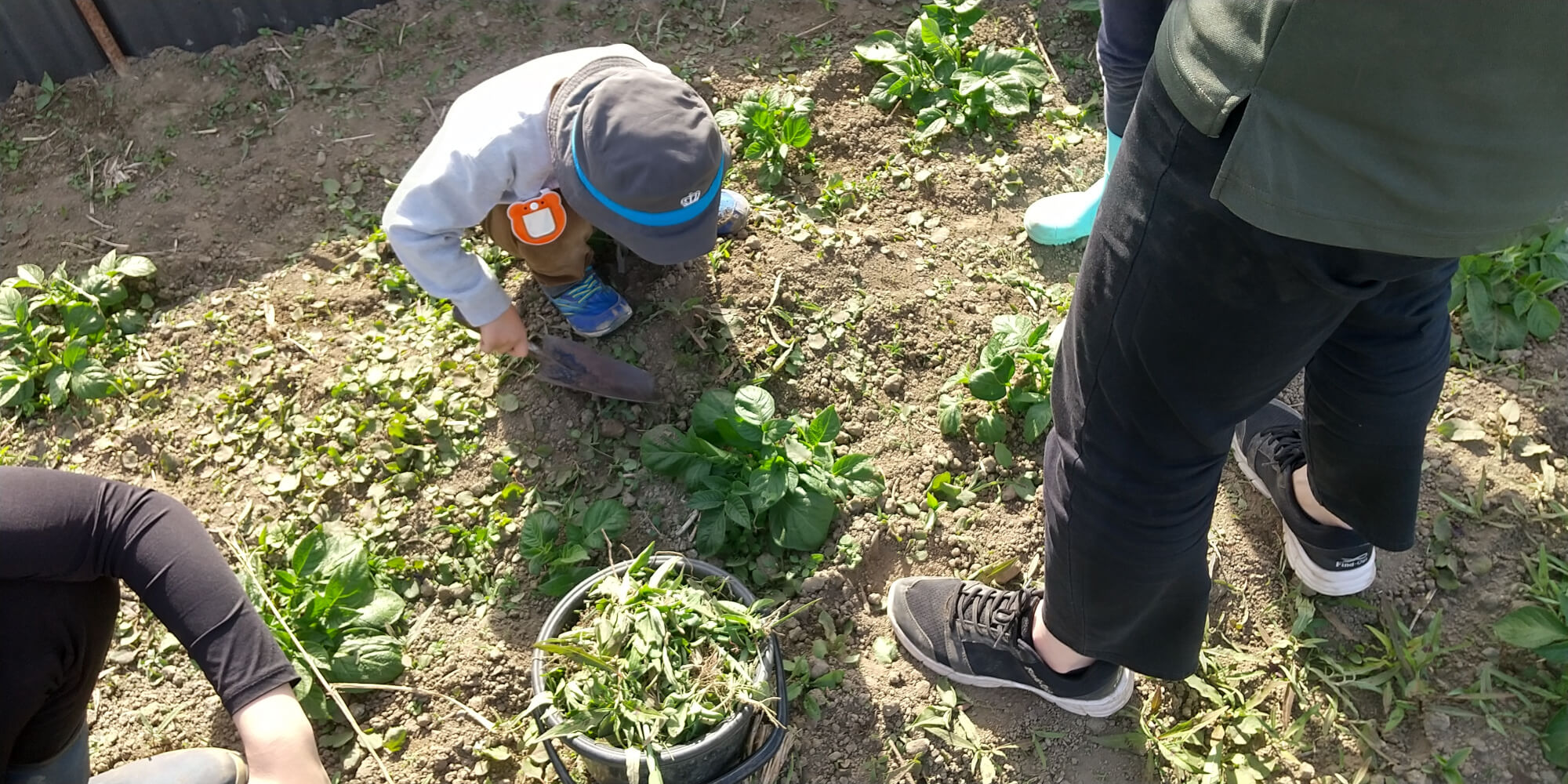 こちらは、じゃがいも畑の草むしりです。3月に種植えをし、大きく育ってきたじゃがいも。雑草抜きを子どもたちとやっている時の様子です。