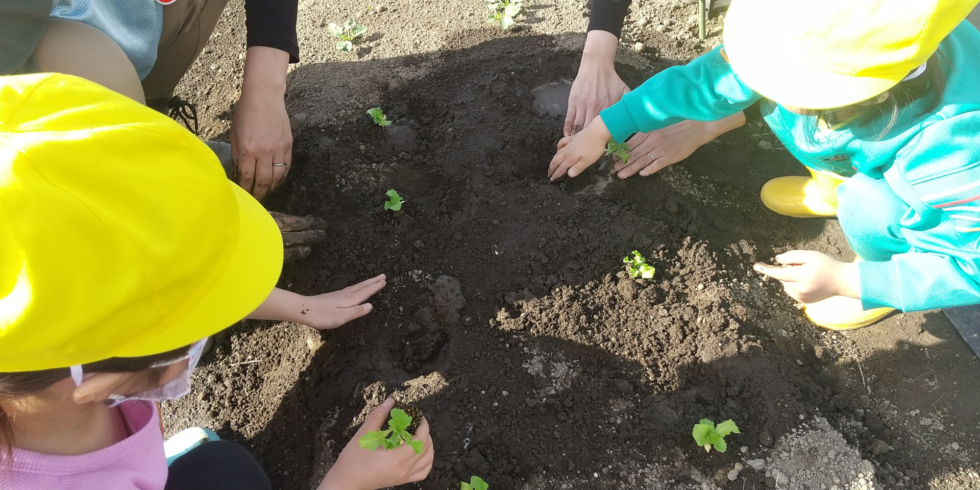 苗植えの畑仕事が初めての子どもたちで、土を触るのは少し苦手なようでした。スタッフが最初に苗植えをやってみますが、スタッフの様子を見て、「やってみる!」と2人とも、苗植えに挑戦することができました。